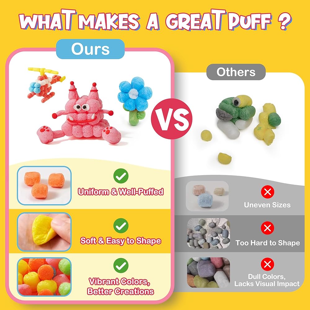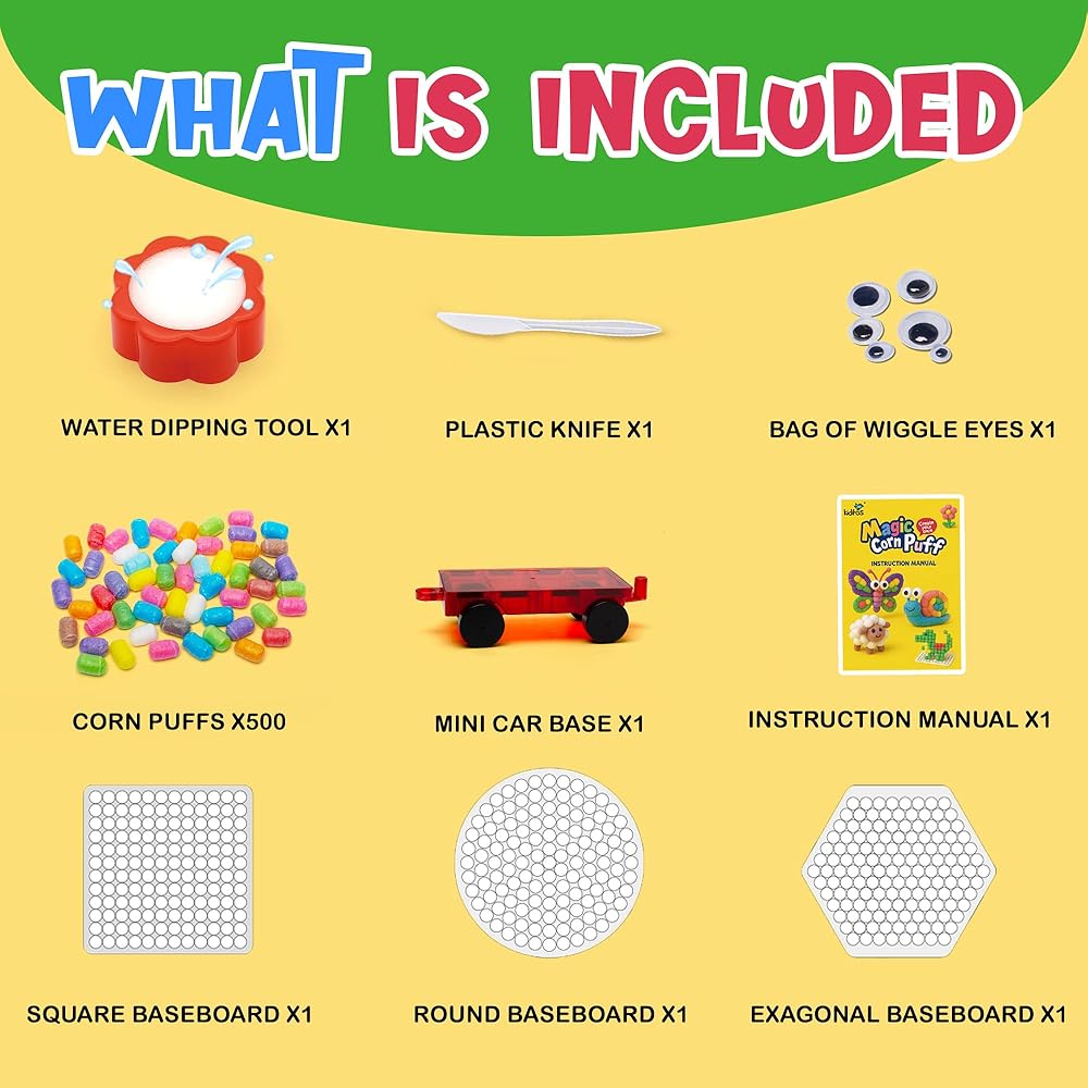 CREATE & IMAGINE IN 3D:Includes over 500 colorful magic corn puffs that easily stick together with just water — kids can build castles, helicopters, animals, flowers, and anything they imagine!