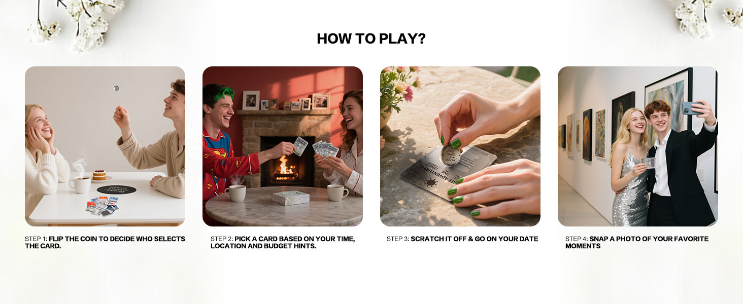 NO COMPLICATED RULES! Flip the custom-designed date night ideas coin (also used for scratching) to decide who picks and scratches a card! Once revealed, you must complete the adventure – no take-backs! Each of the 52 scratch-off date cards includes helpful clues about your mystery date: time of day, budget, length, and whether it's indoor or outdoor, so you'll know what to expect before your fun date night begins.