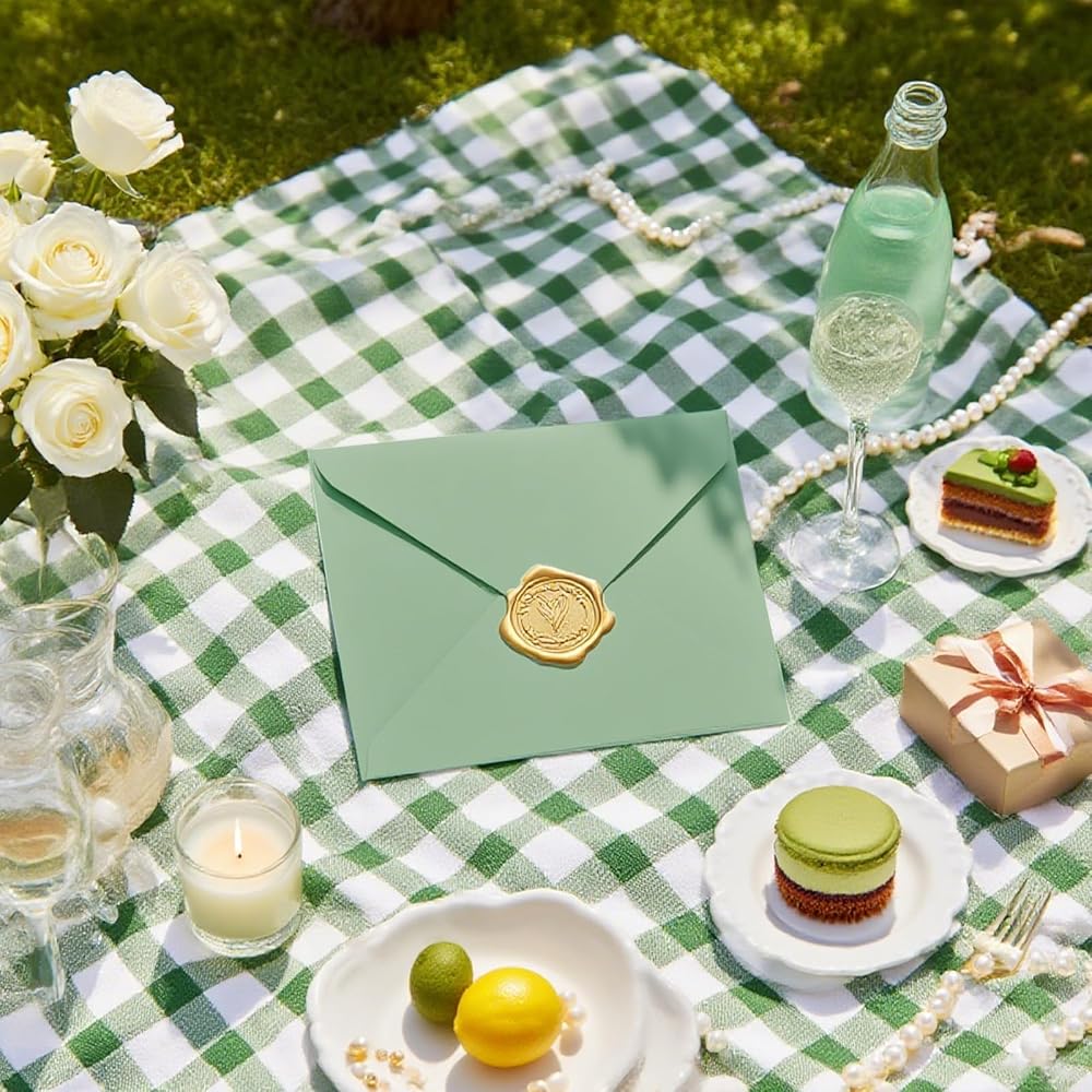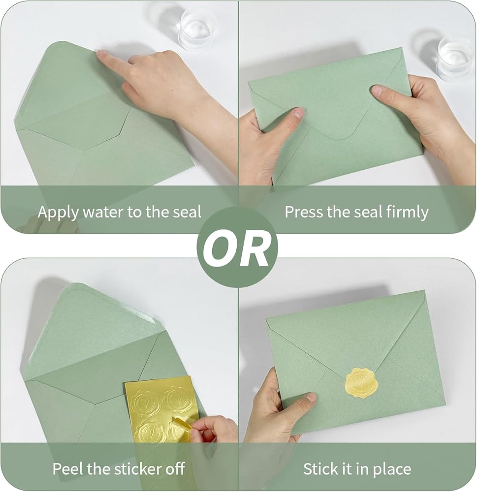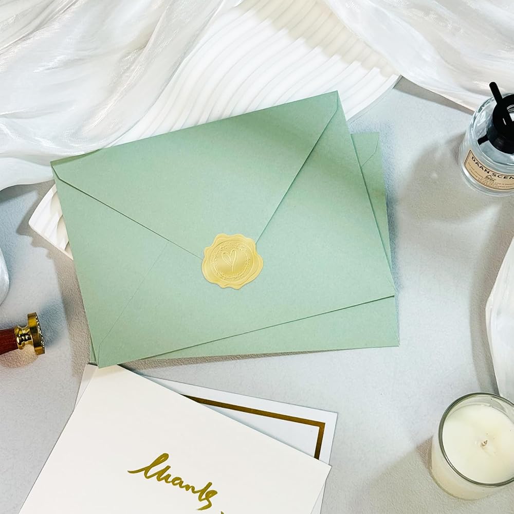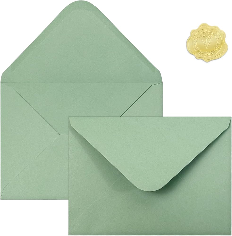 Package Includes: 50 A7-sized (5.25 x 7.25 inches) sage green envelopes and 50 gold stickers are included in this set.