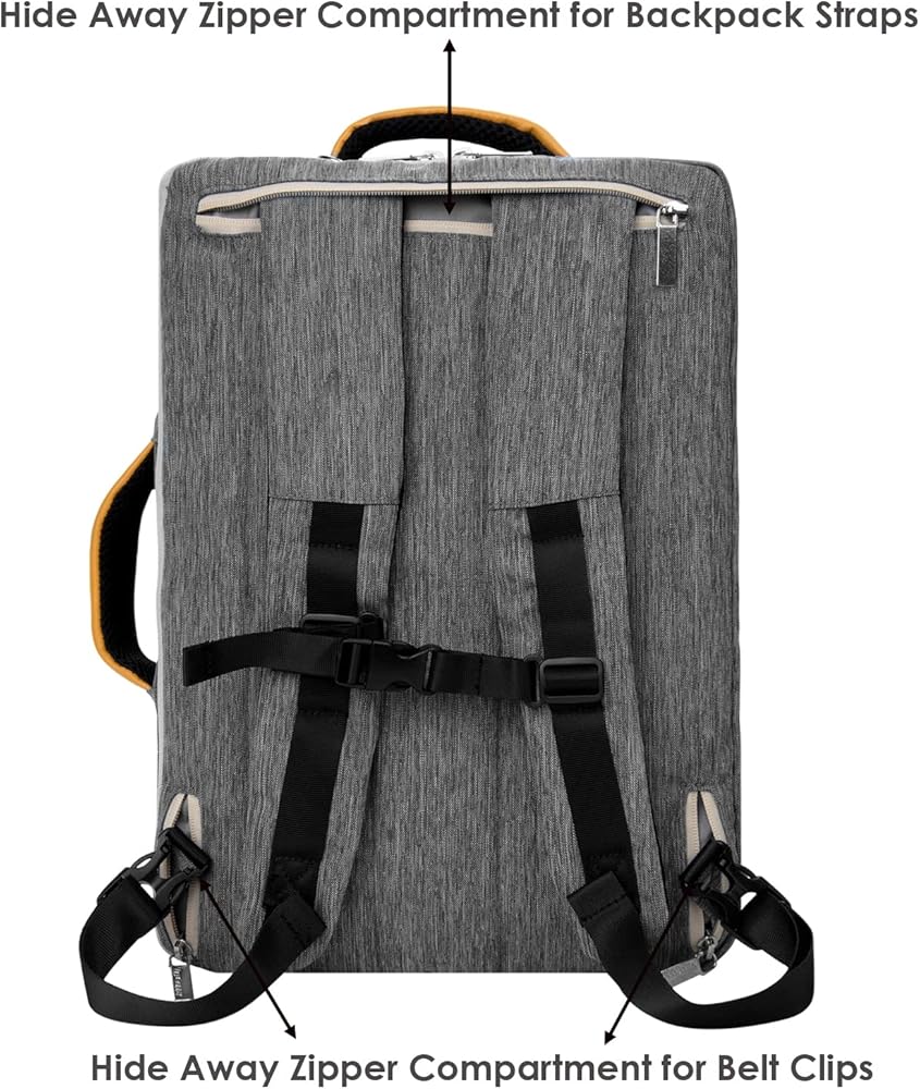 With hideaway straps, the bag easily converts from being a laptop backpack to a shoulder or messenger bag. This lets you carry the bag the way you want be it for business meetings, work trips, travel or outdoors. Padded top handles let you carry the bag as a briefcase too.