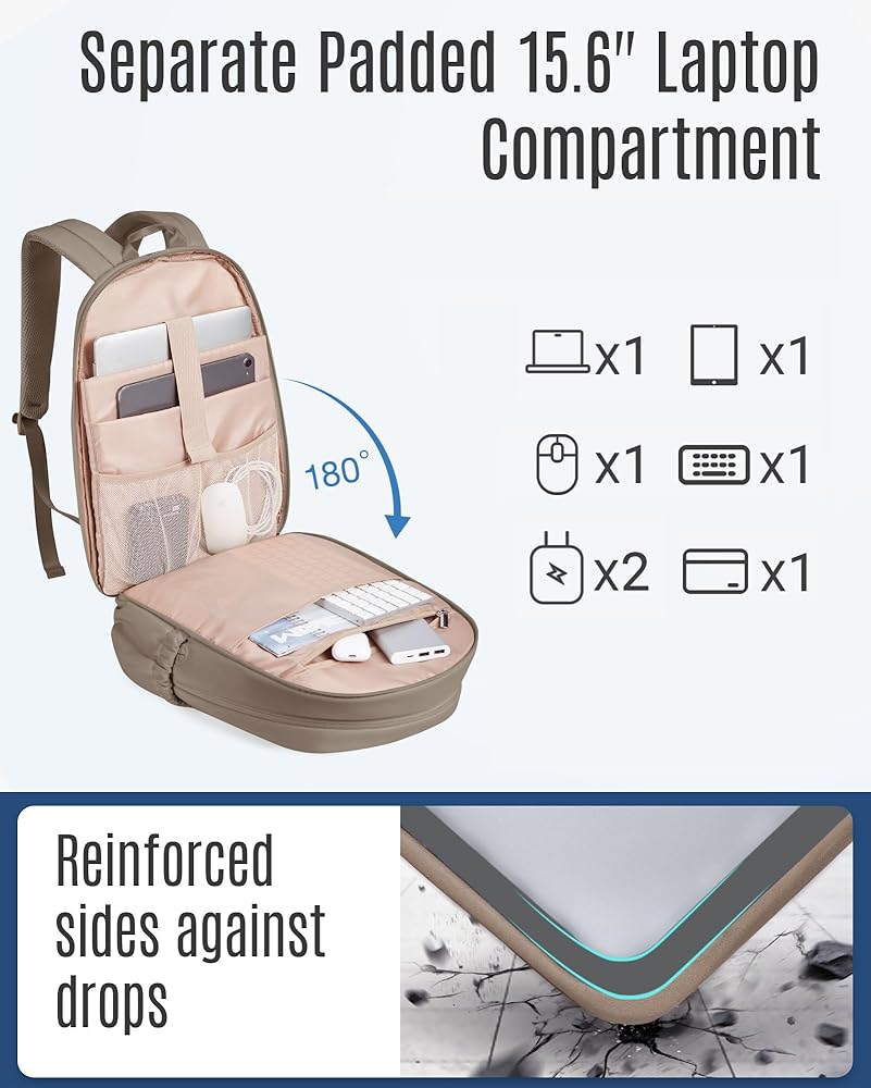 【Large Capacity】Separated laptop compartment features a 180° opening for easy access and can accommodate up to a 17.3 inch laptop, tablets, and tech accessories. Backpack for women is designed to fit daily essentials in the roomy main compartment, including A4 folders, magazines, chargers, power banks, and clothes. Complemented by two front compartments with a key fob hook, accessories pockets, and many small pockets. Side pockets for water bottles, and umbrellas