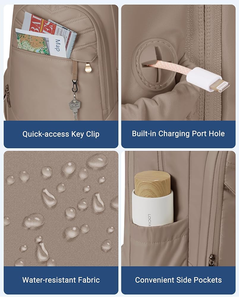 【Comfortable& Travel Friendly】Travel backpack for women with ergonomically designed shoulder straps, padded back panel and breathable materials alleviate the weight and enhance comfort. The back luggage strap for easy placement on luggage trolleys, lightening the load during travel. Backpack purse for women equipped with a charging hole in the side pocket enables easy phone charging on the go