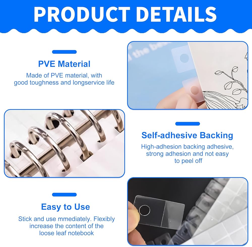 Our 300 PCS Sturdy Ring Binder Stickers are a versatile organizational tool designed to help users secure, reinforce, and display their documents, photos, or retail items with ease. Whether you need to convert unpunched pages into binder-ready sheets or hang lightweight products in a store, these self-adhesive accessories provide a seamless, mess-free solution.