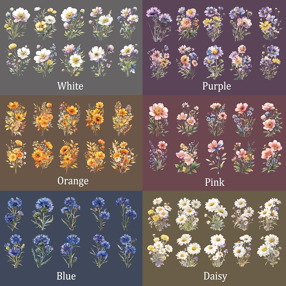 120-piece set features 60 one-of-a-kind floral designs—including cornflowers, daisies, lavender, roses, and sunflowers—in soft blues, whites, purples, and oranges. Perfect for scrapbooking memories, junk journaling stories, or adding a touch of nature to your bullet journal spreads.