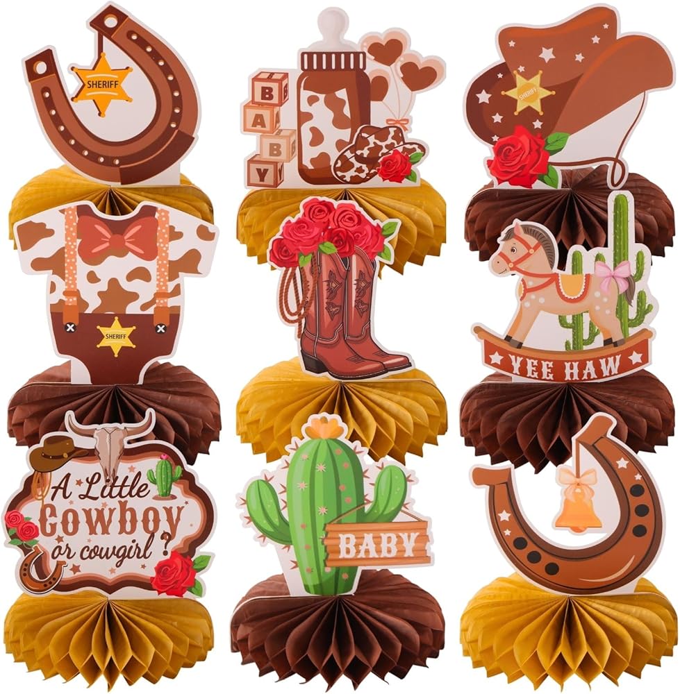 Delicate Wild West 1st Birthday Party Favors: The cool western Cowgirl design adds the touch of active and sophistication to party decor, making it a standout event. Our 9pcs honeycomb centerpieces come in wild west Cowgirl, ONE, cactus, skulls, boots, barrels, Cowgirl hat and gold badge patterns in a beautiful combination of varous color. It will add much touch of charm to a western Cowgirl style 1st birthday party
