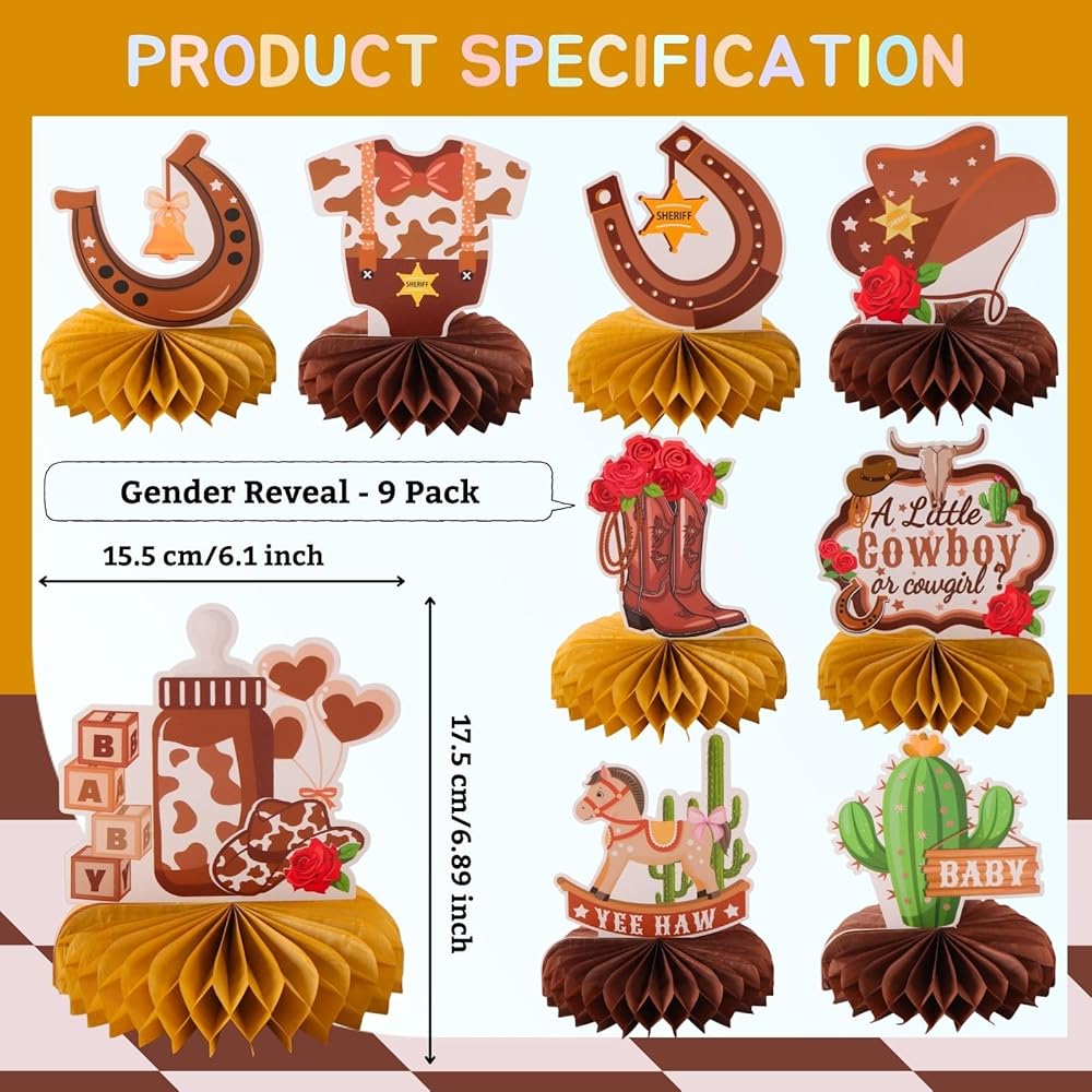 Pacakge Include: 9 x A Little Cowgirl' s First Rodeo Honeycomb Centerpieces