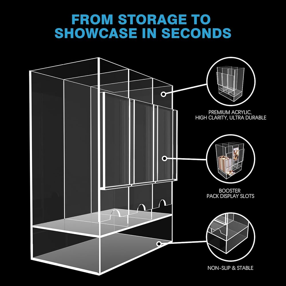 Constructed from durable, high-clarity acrylic, it ensures your booster packs are always visible while staying protected from dust and damage. The three spacious slots allow you to organize multiple packs for easy access during gameplay or sales. Its compact footprint (11.8 x 5.5 x 8.9 inches) fits neatly on desks, shelves, or counters without taking up unnecessary space.