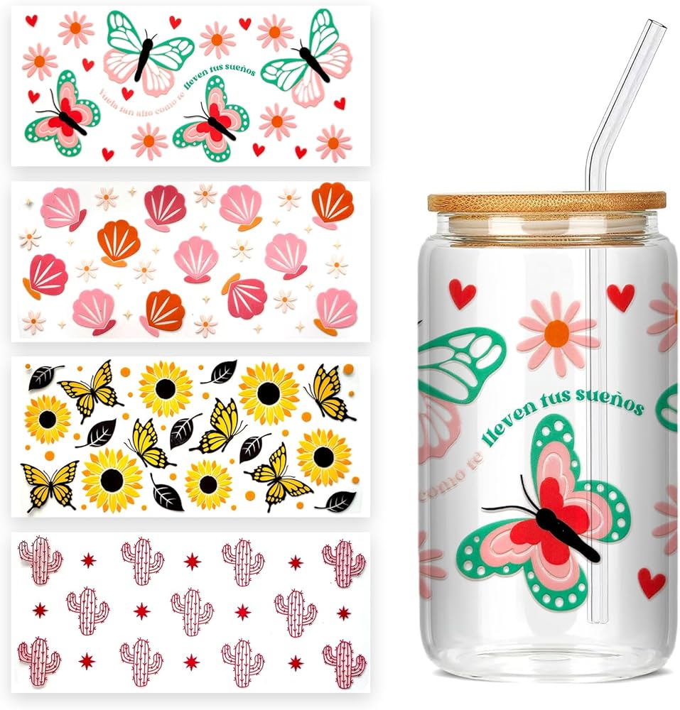 4 Sheets UV DTF Cup Wrap Transfer Stickers for DIY Craft Decorations for 16oz Glass Water Bottle