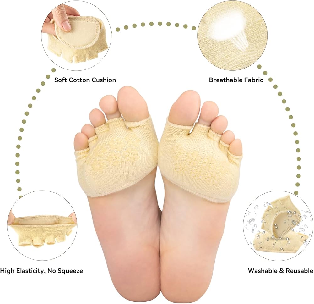 ☑️【TOE SPACERS & COMFORT】: These toe separator socks helps reducing friction between toes and relieving pressure on the forefoot. Especially effective alleviate pain if you are on your feet for long periods of time and other high impact activities such as standing, running, dancing, etc. No matter you wear with sandals, boots with insoles, slippers, heels or under any socks, this ball of foot pads will hold firm without sliding or bunching inside socks and shoes.