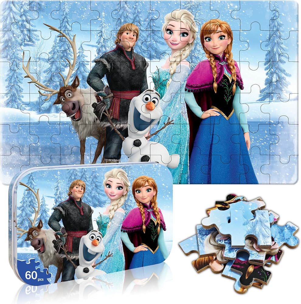 Easy to Assemble: Puzzles for Kids Ages 4-6 Content 60 pieces puzzles and a 1:1 reference poster to help children complete it on their own; It comes in a metal box for easy storage; Each piece is 1.24" x 0.93". The finished size is 9.5' x 5.9'.The metal box size is 5.27" x3.3" x1.2" ; Ideal as party gift