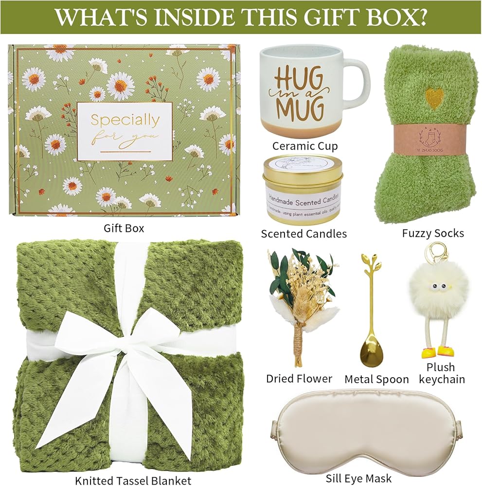 9 PCS SELF CARE GIFTS FOR WOMEN: This exquisite green spa gifts box is thoughtfully curated with 9 luxurious essentials: 39*59in knitted tassel blanket, ceramic mug, stainless steel spoon, lavender scented candle, silk eye mask, fuzzy socks, dried flower, plush keychain and elegant gift box. Such a heart-warming Gifts for Women Birthday! This self care gifts lets the special woman in your life indulge in ultimate relaxation and cozy comfort. An unforgettable unique present that shows how much you care