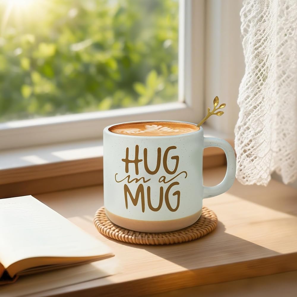 CERAMIC MUG WITH SPOON: This ceramic mug features an elegant "Hug in a Mug" design, both sturdy and heat-resistant, it is ideal for enjoying hot coffee, tea or any favorite beverage. The ergonomic handle offers a comfortable, secure grip, while the included 18/8 stainless steel spoon provides a sophisticated finishing touch. Whether for quiet morning moments or relaxing evenings, this mug set is the perfect care package to warm your hands and heart