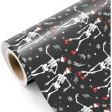 Christmas Design: Skeletons wearing Santa hats and red boots, dancing on dark paper with snow and polka dots, creates a alternative and fun festive scene. The Christmas wrapping paper will make your gift wrap more special.