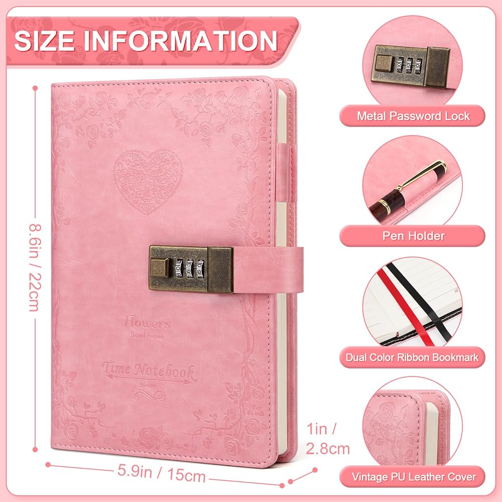Toplive Diary with Lock, A5 Locking Vintage PU Leather Journal Notebook for Women Men Journal with Lock, Refillable Girls Password Diary with Retro Rose Pattern, Pink