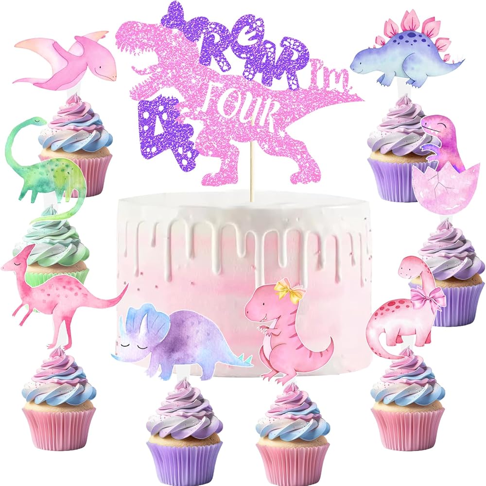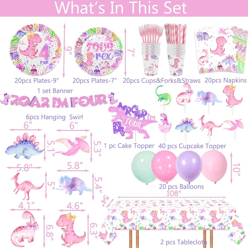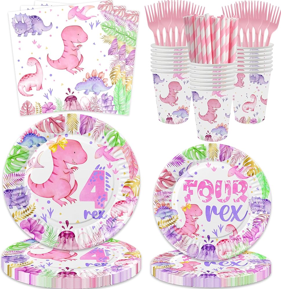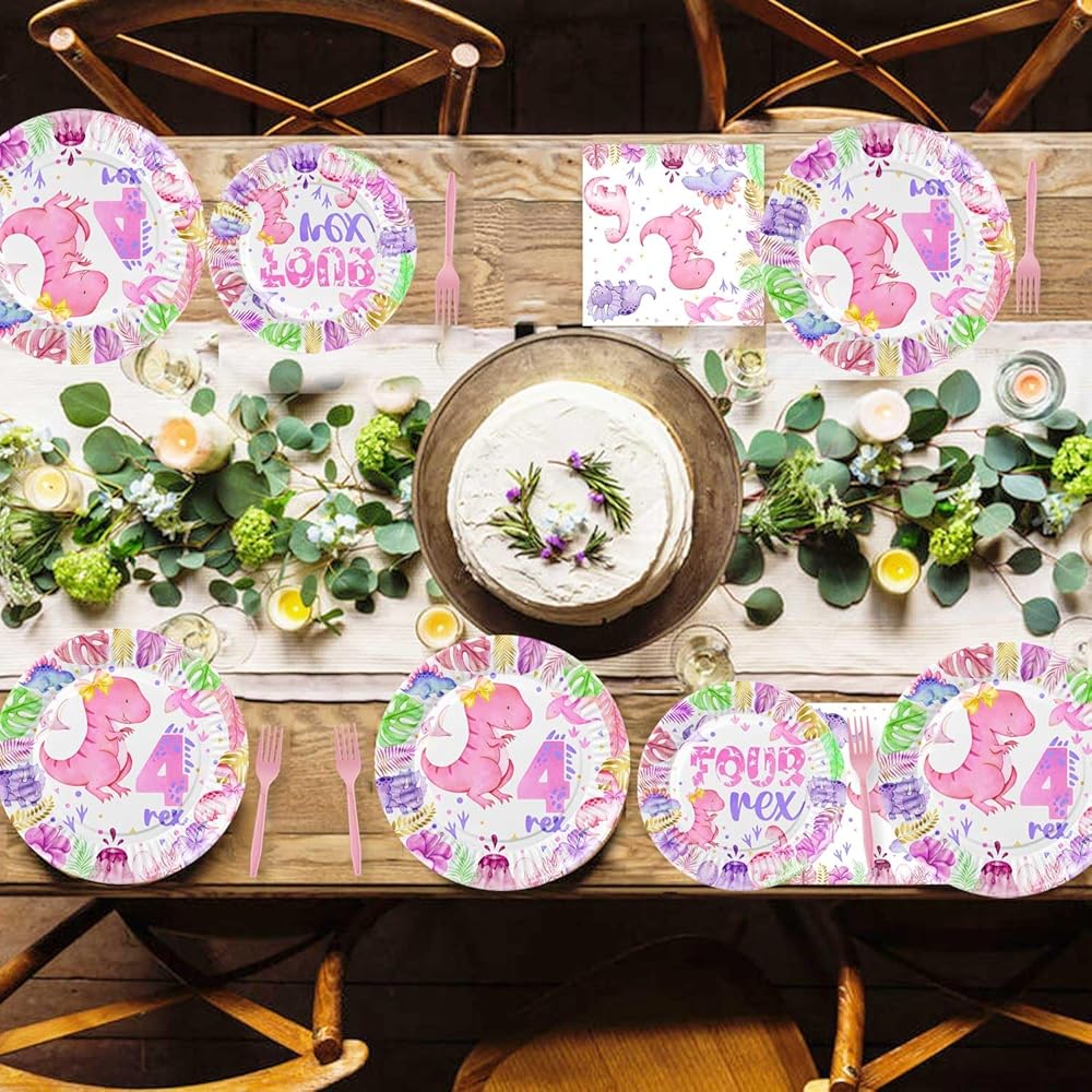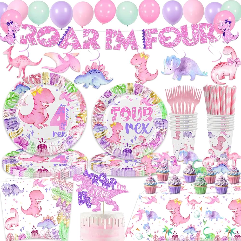 Girl dinosaur 4th birthday party supplies are great to decorate dino 4th birthday party, dinosaur 4 rex party, Roar I'm Four birthday party, Girls four years old birthday party, etc