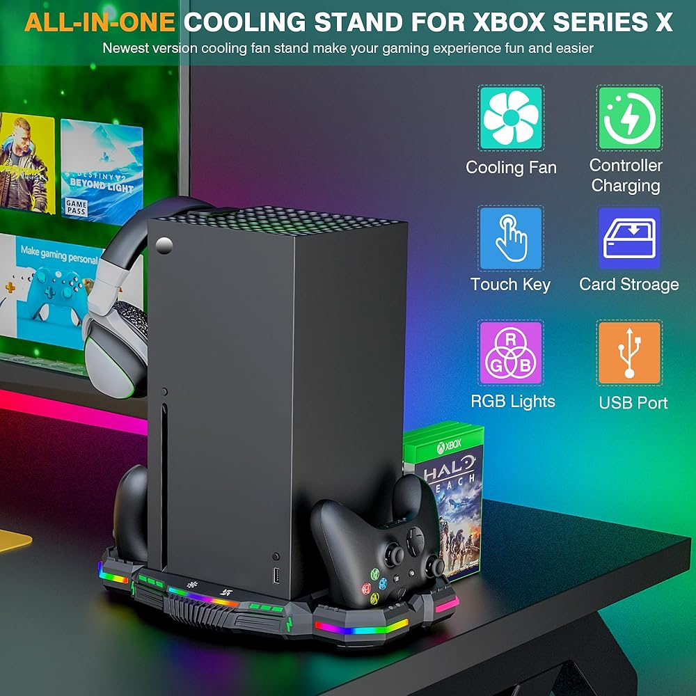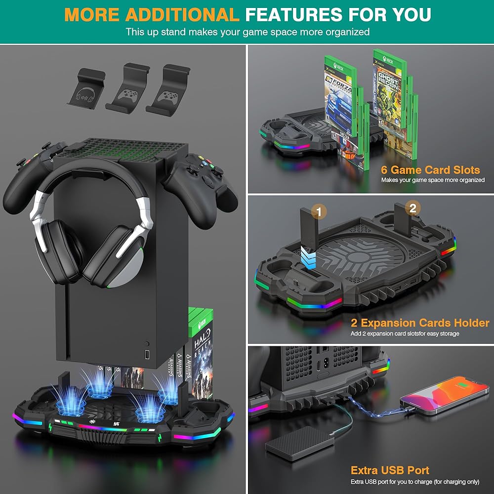 【BETTER USE OF YOUR SPACE】If you're after more than just the basic stand for your Series X, a more complete, all-in-one dock is an excellent solution - in customers' experience, this upstand acted as a neat little space-saver that we quickly couldn't live without it. This Xbox Series X cooler stand with a controller charging station has an extended USB port for game transfer, and the other USB port for charging to charge your headset/mouse/phone. Makes your game space more organized.
