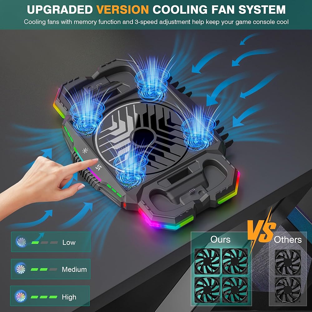 【BUILD YOUR PLAY STYLE】The cooling fan stand to change the RGB color lights with 14 different effects modes, including 5 dynamic light modes + 7 static light modes + long touch-switch to turn off + light touch-switch reboot memory mode. The color LED lights are a nice addition at night and are relaxing to watch and add to a fashionable game room.