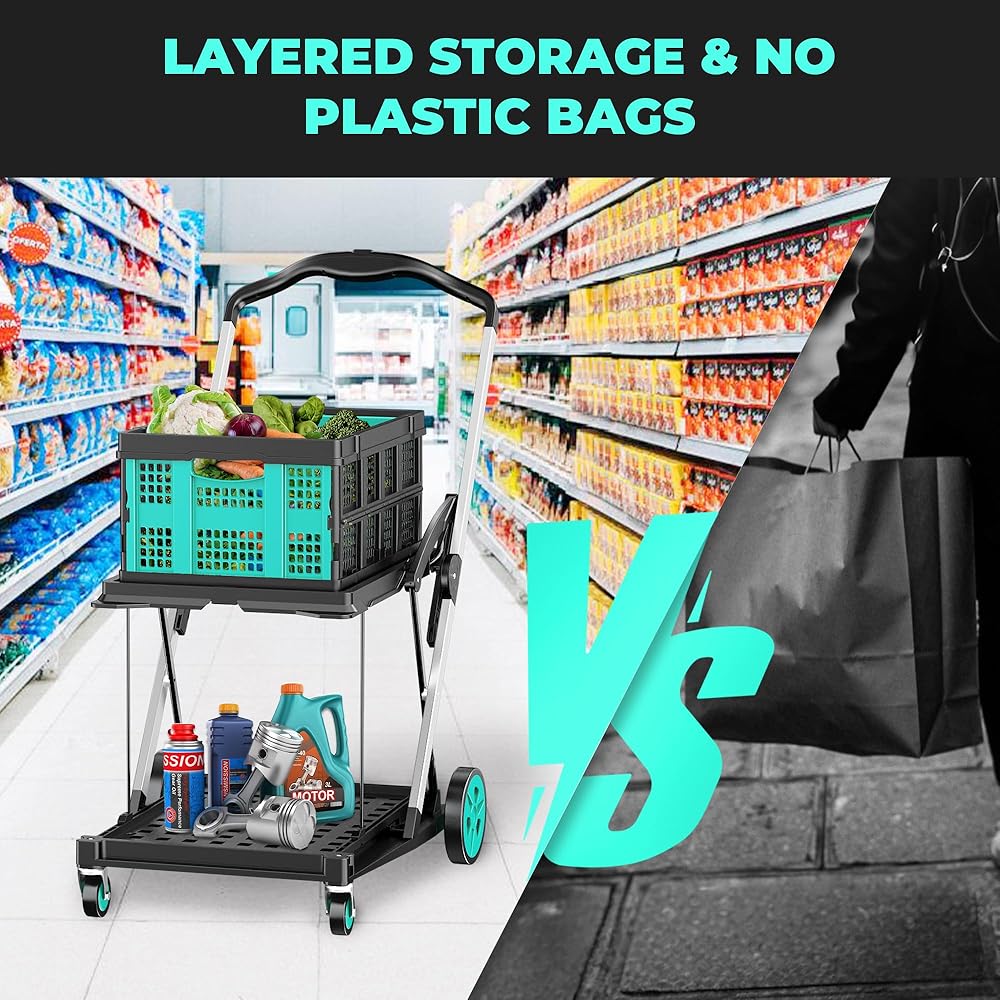 【All-round Excellent Product】:This folding shopping cart with wheels allow you to carry or transfer lots of items in shopping malls, garages, libraries,office, home and camping with little effort.Double-basket design, facilitating the classification and storage of items.