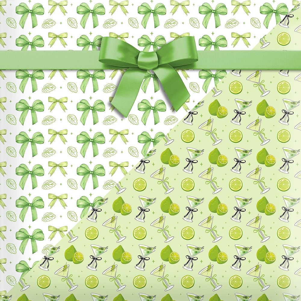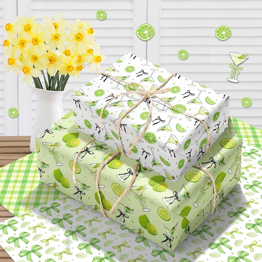 Ywdbzjhs 12 Sheets Martini Wrapping Paper, 19.7 x 27.6 Inch Green Bow Martini Glasses Gift Wrap Paper Folded Flat for Matte Bachelorette Party Birthday DIY Crafts, 6 Styles