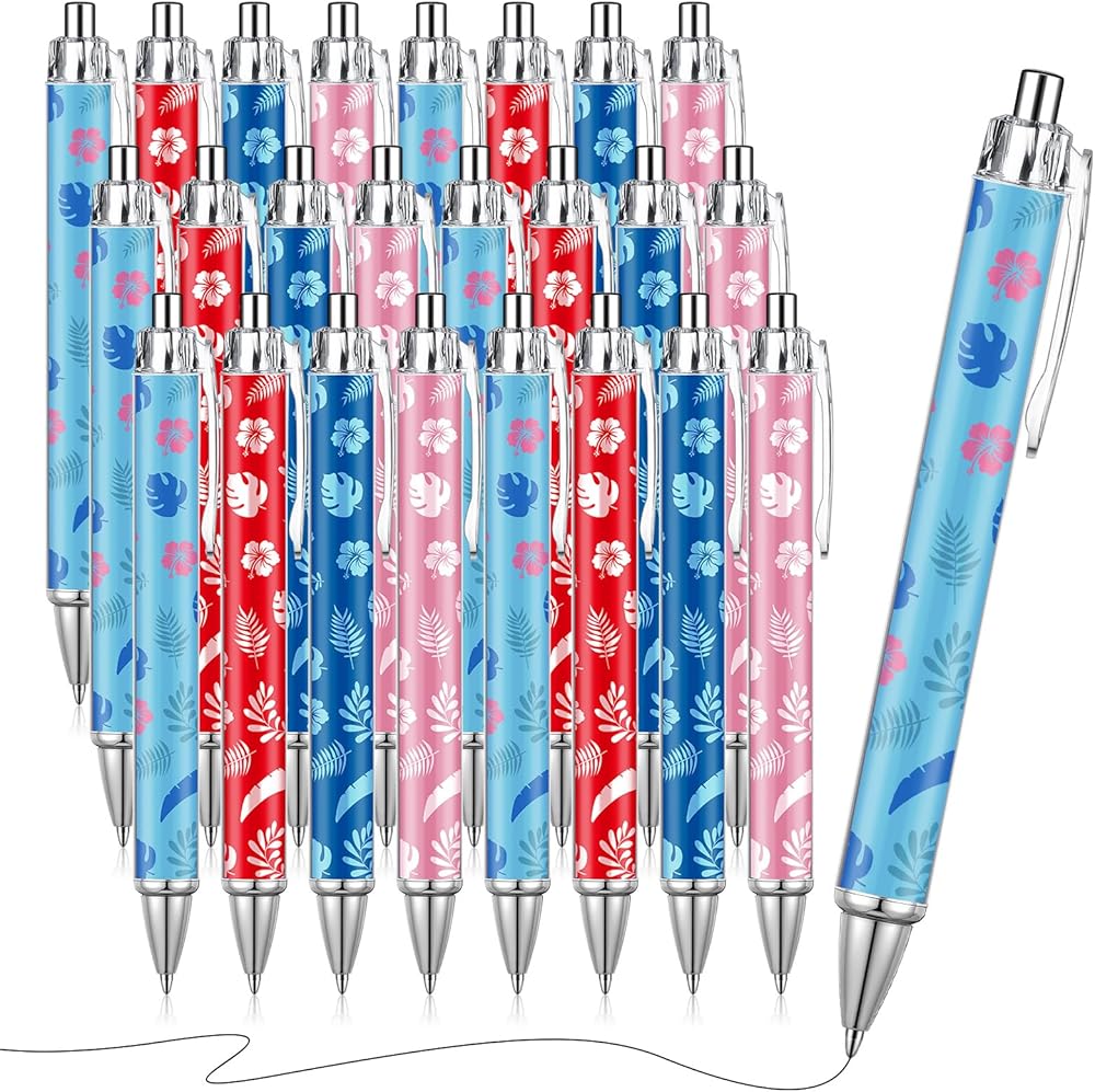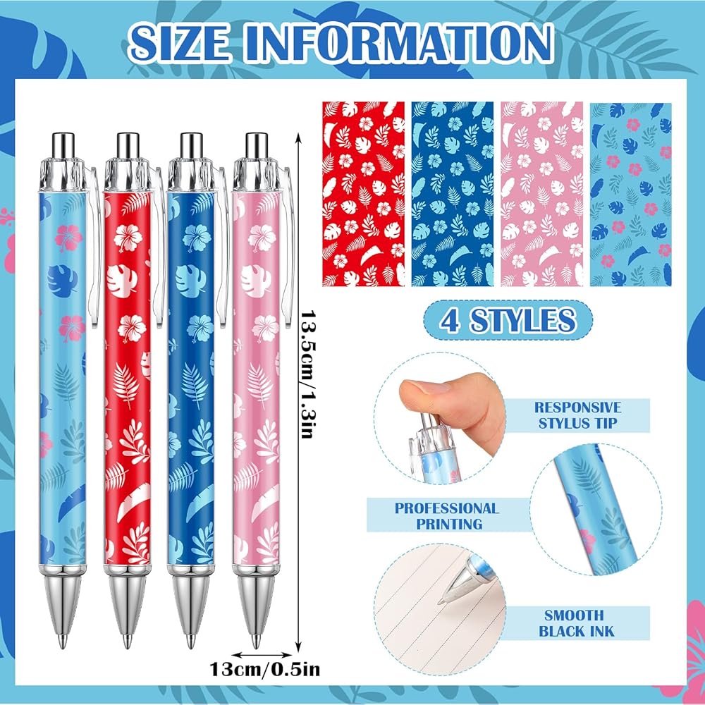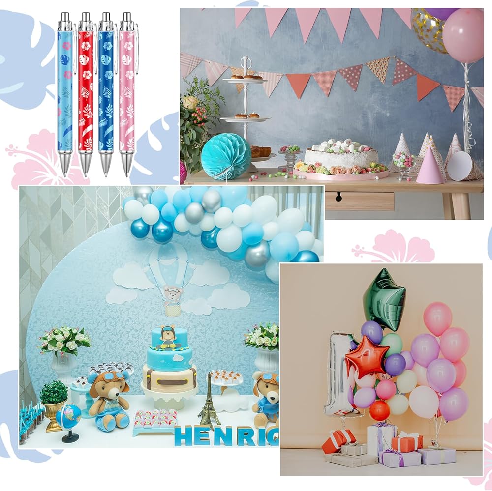 • Birthday Decor Essential: add a touch of holiday charm with our luau retractable pens; Whether as part of a centerpiece or nestled into stockings, their luau styles enhance any birthday decor scheme effortlessly