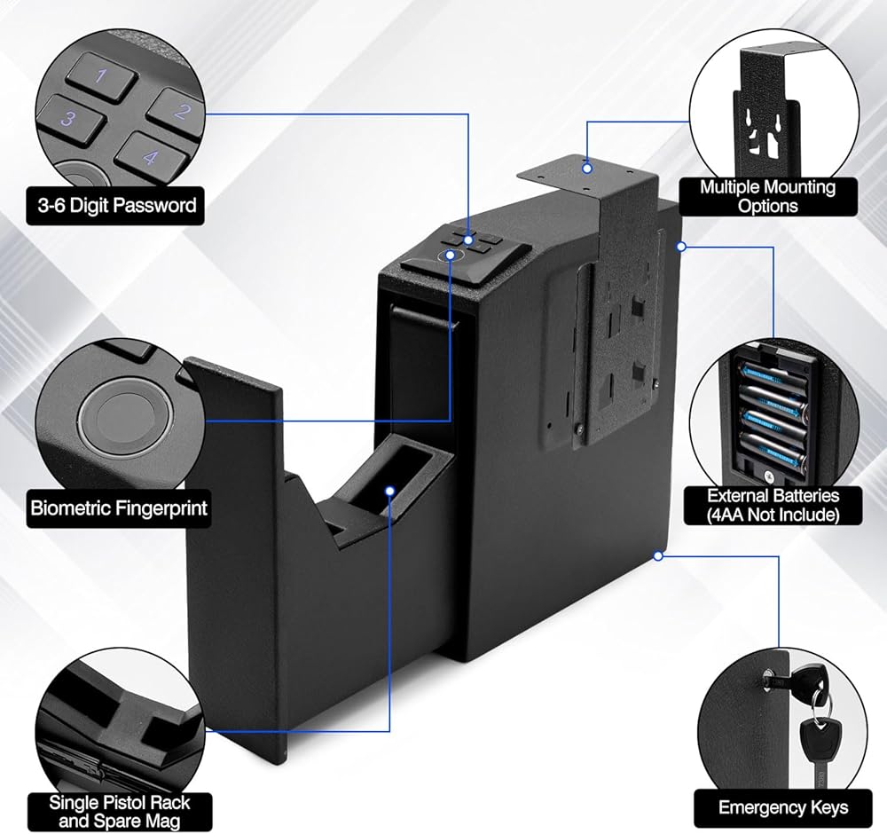 【3 Ways Quick Access Mode】The beside hand gun safe allows you to get quick access to your handgun through one-handed operation in just a fraction of a second. The mounted sider hand gun safe can also be locked with keypad or fingerprint in case of emergency, bringing your life more convenience and security at the same time.