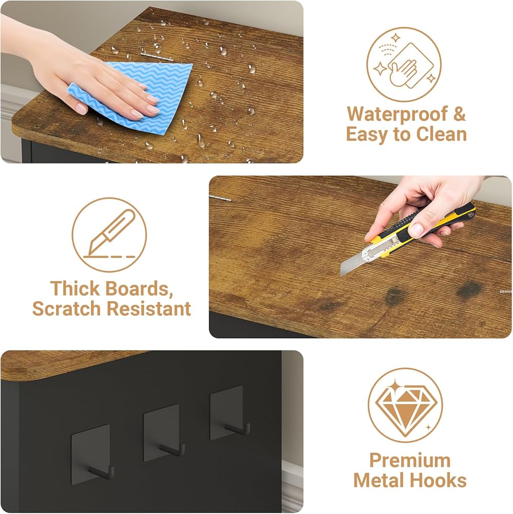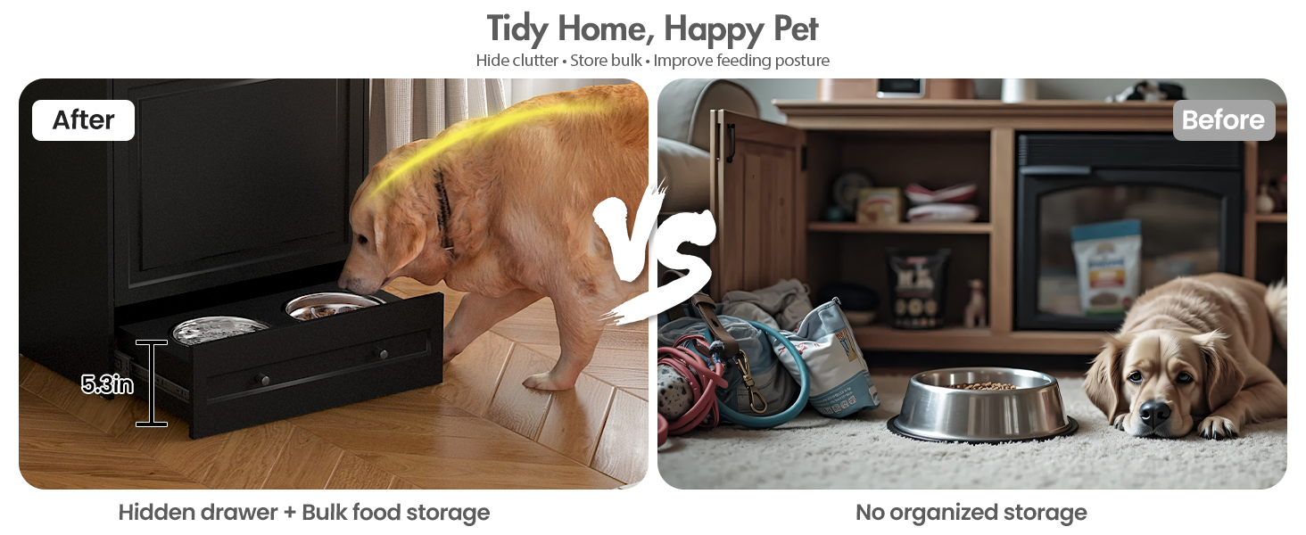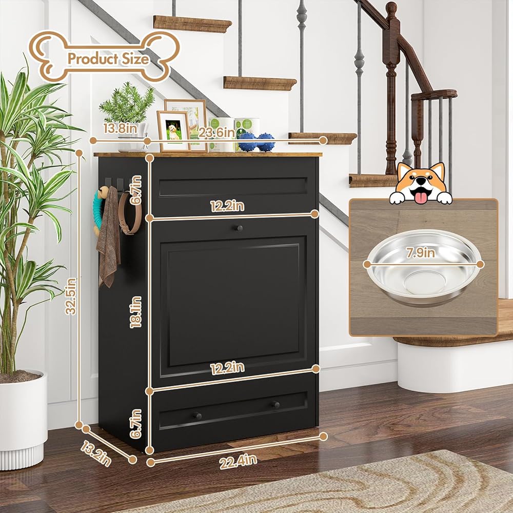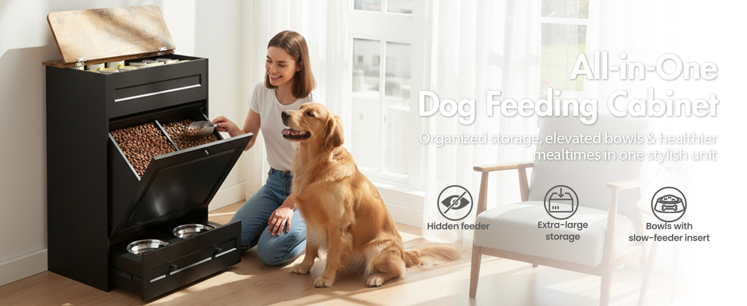 【4-in-1 Dog Feeding Station】Combines a dog food cabinet, hidden elevated bowls, lift-top storage, and side hooks. Keep pet supplies organized while giving your dog a healthy, comfortable feeding spot.