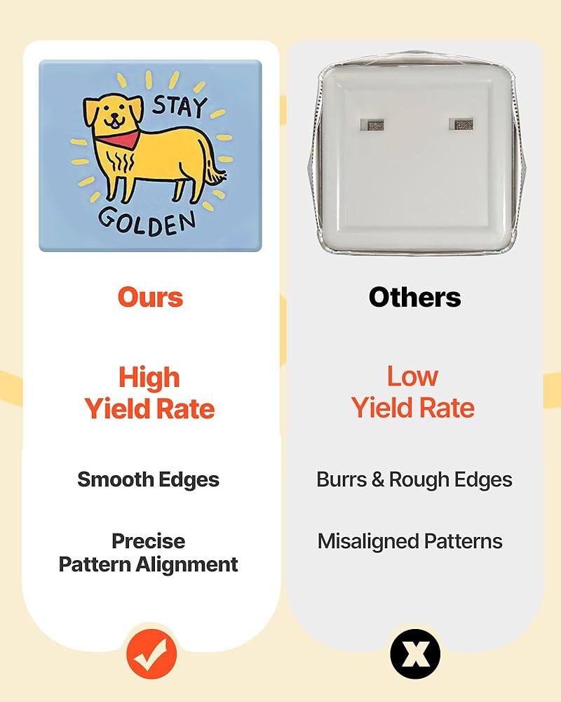 High Success Rate: Precision molds and alignment guides help avoid tilted designs, ensuring ideal outcomes every time. It is recommended to use 127-157g paper (135g performs especially well). Avoid mold shifting while using the button maker machine