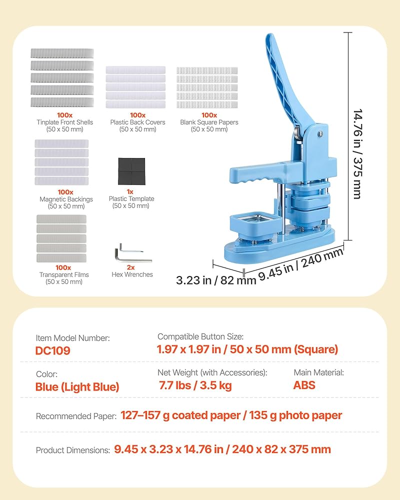 VEVOR Button Maker Machine, 1.97 x 1.97 in Square, Plastic Pin Maker with Tinplate Front Shells, Plastic Back Covers, Magnetic Backings and Transparent Films, Ergonomic Handle, for DIY Badges, Blue