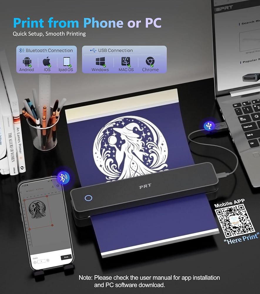 ✅ 【Multi-Device Connectivity – Phone, Tablet, or PC】 MT660 Stencil Printer connect via Bluetooth or USB to iPhone, Android, Windows, or Mac devices. Whether you work from your phone or laptop, you'll enjoy a smooth, reliable workflow. (❗Note: Bluetooth not supported for PC—please use USB with the included driver.)