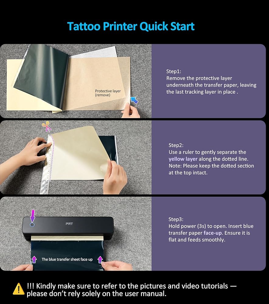 ✅【Quick Paper Setup – Ready to Print in Seconds】 How to load tattoo transfer paper: 1.) Remove the third clear protective layer (the bottom sheet beneath the blue transfer paper) 2.) Use a ruler to tear off the first yellow backing layer (the top sheet) along the dotted line 3.) Turn on the printer 4.) Place the paper into the printer — blue side facing up, with the #2 tracing layer on top You're now ready to print tattoo stencils with ease. Need help? Feel free to contact us anytime.