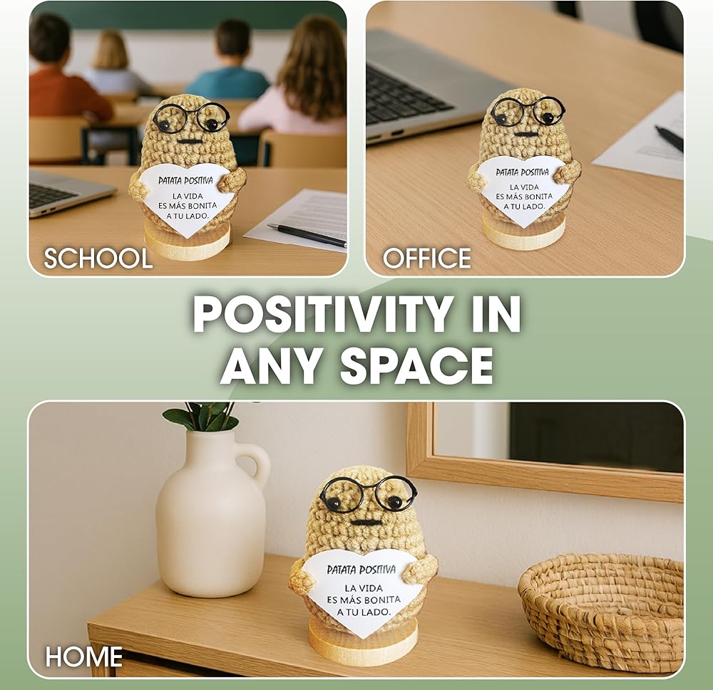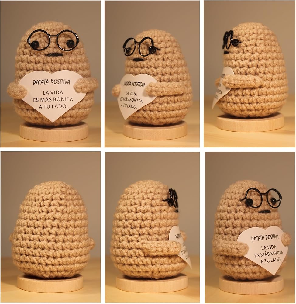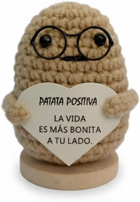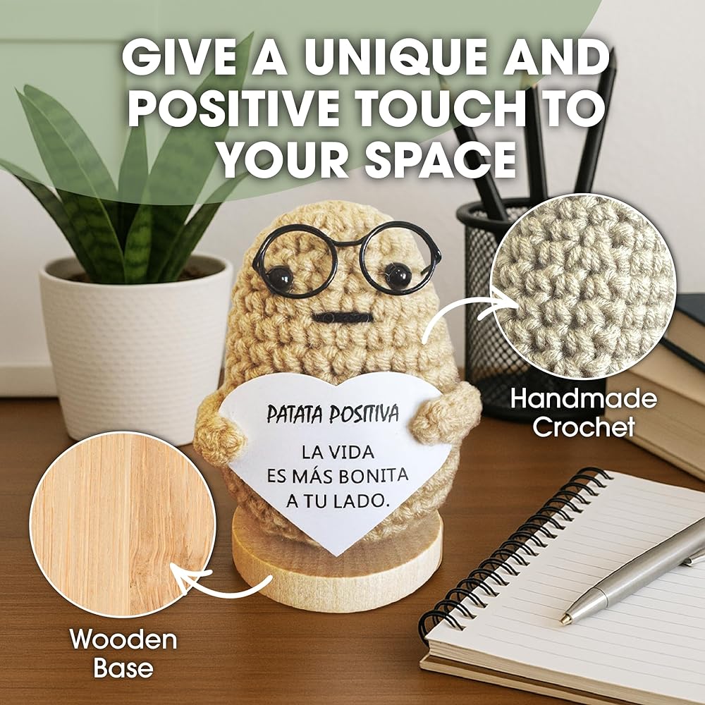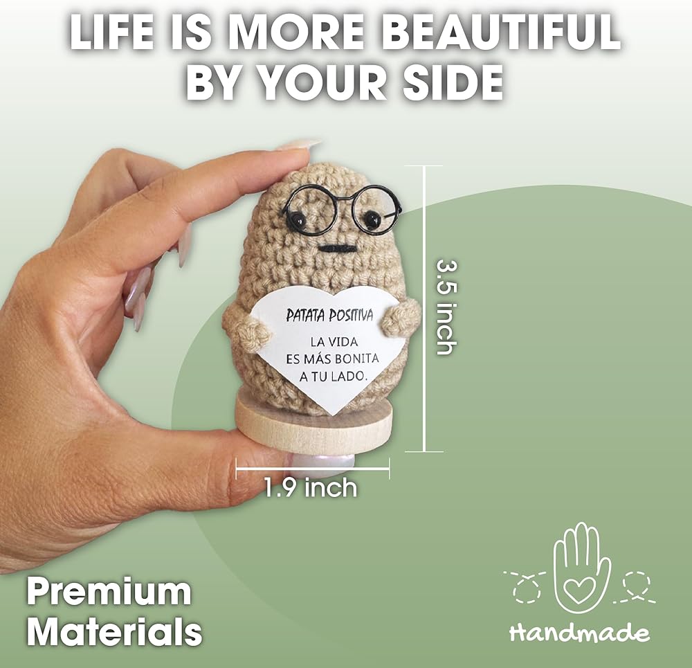 Positive Potato Doll – Handcrafted Crochet Doll with Heartfelt Message – Motivational Gift for Office and Home – Emotional Support – Light Brown, 3,5 Inch. (Spanish Message)