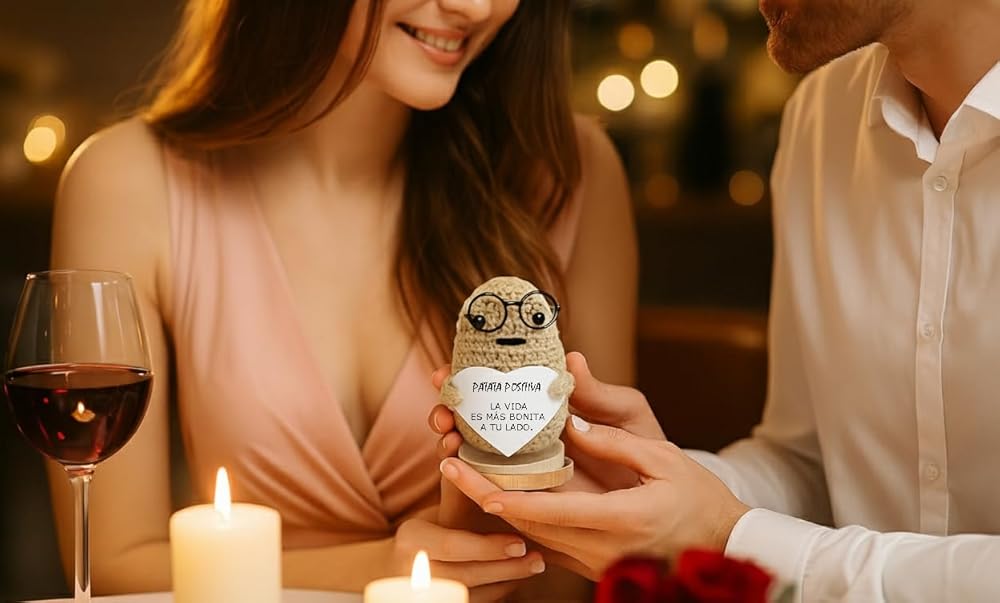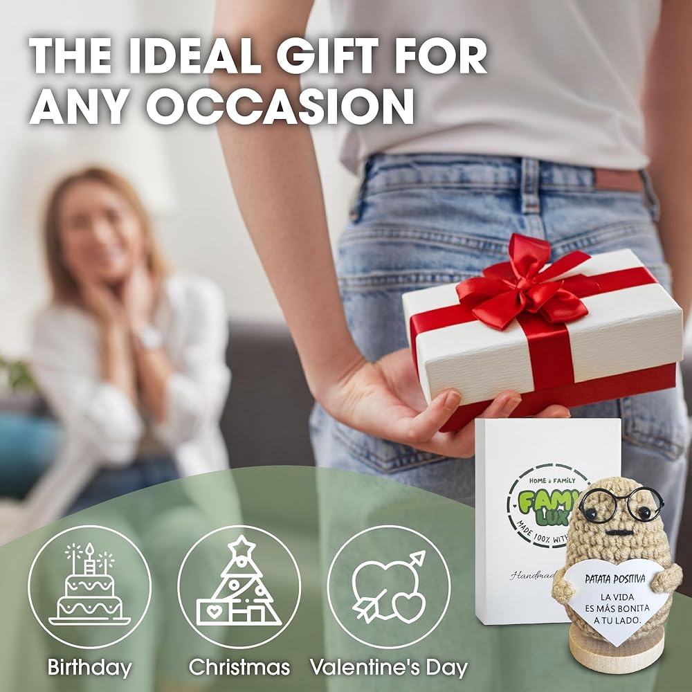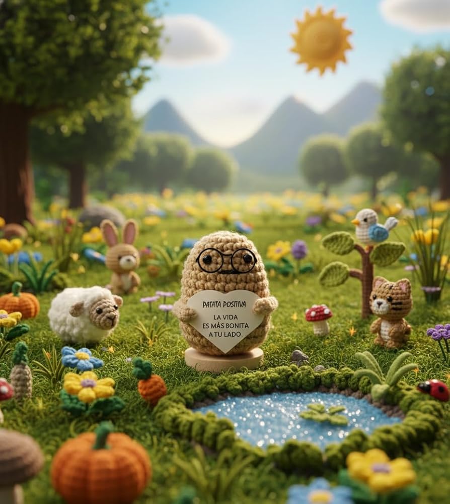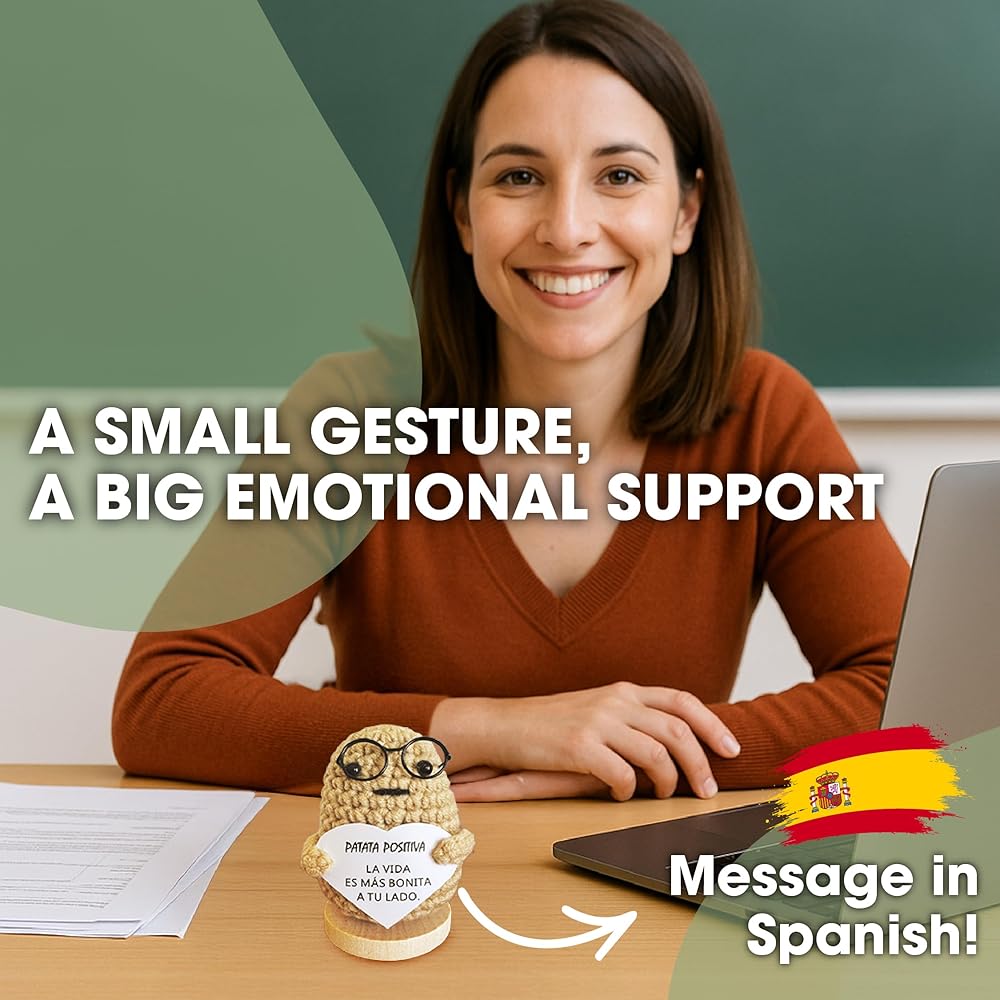 Positive Potato Doll – Handcrafted Crochet Doll with Heartfelt Message – Motivational Gift for Office and Home – Emotional Support – Light Brown, 3,5 Inch. (Spanish Message)