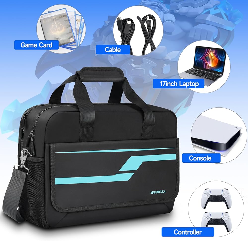 [Multifunctional Storage Design] - This carrying case for ps5 has multiple storage spaces. Not only can place the PS5 devices but store some other accessories such as game discs, power cables, headphones, USB cables, media remote controls, etc. Inside has a large compartment that can be used to hold up to a 17" laptop, and has mesh bags on case each side. Meets all your needs for ps5 travel case