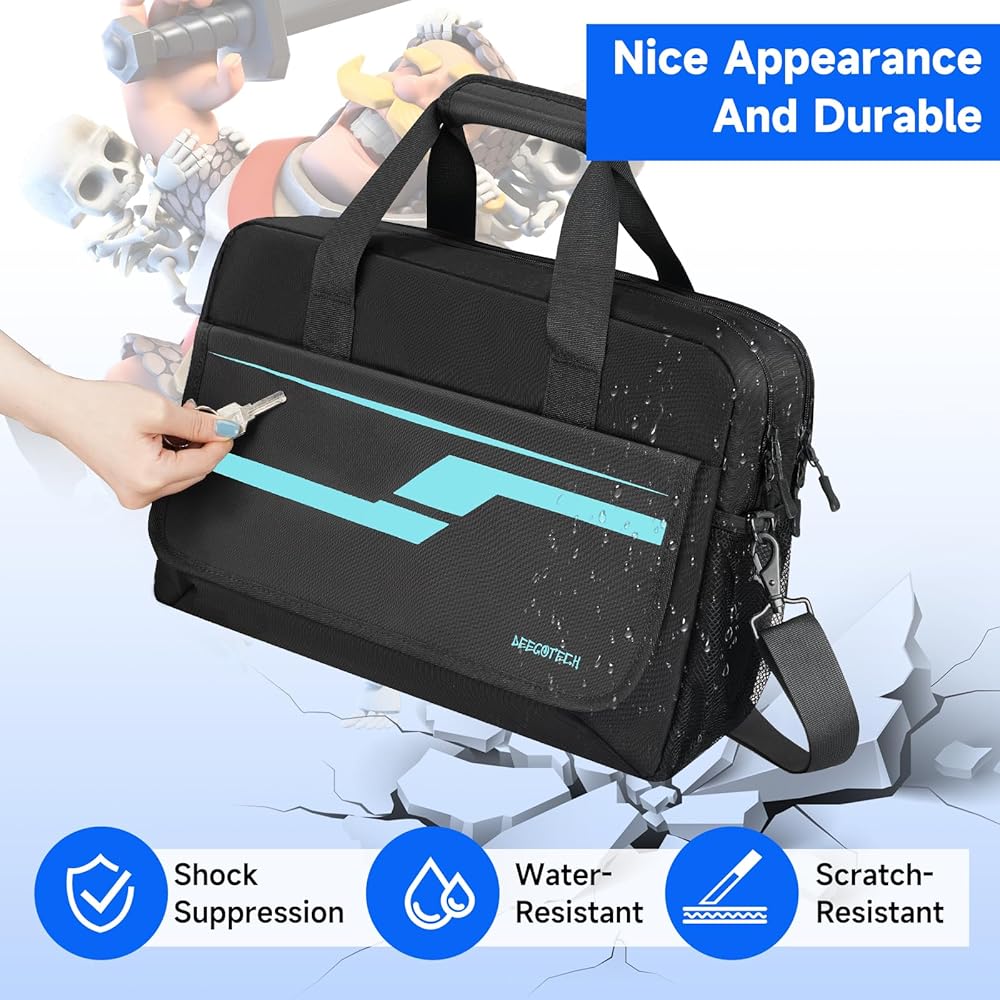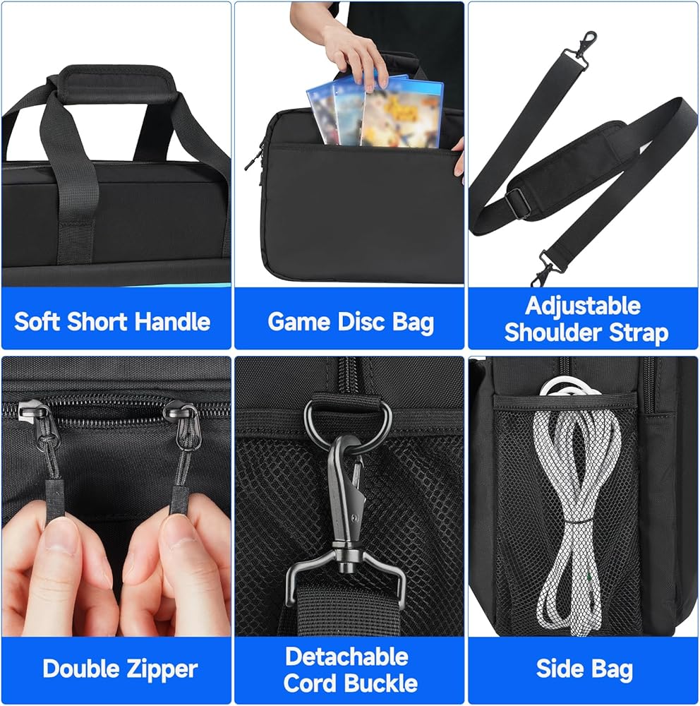 [Strong & Comfortable] - This travel case for ps5 is made of water resistant,tear resistant nylon, thickened PEP pearl cotton, and smooth lining material to protect your console and game accessories from damage. Equipped with a thickened short handle and an adjustable ergonomic shoulder strap with a thickened shoulder pad, it reduces your fatigue while carrying