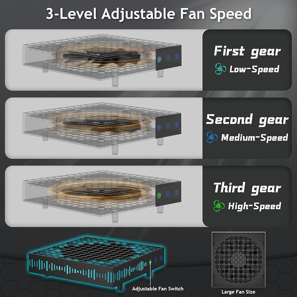 【High-speed Large Cooling Fan】This fan cooling system for Xbox Series X has a larger size and increased to 9 fan blades, which makes the cooling fan have stronger wind and less noise during operation. This high-speed cooling fan for Xbox Series X has 3 gears adjustable fan speed (up to 1800RPM). This cooling fan for Xbox Series X can quickly suck out the hot air in the console, effectively reduce the temperature of the console and improve its performance.