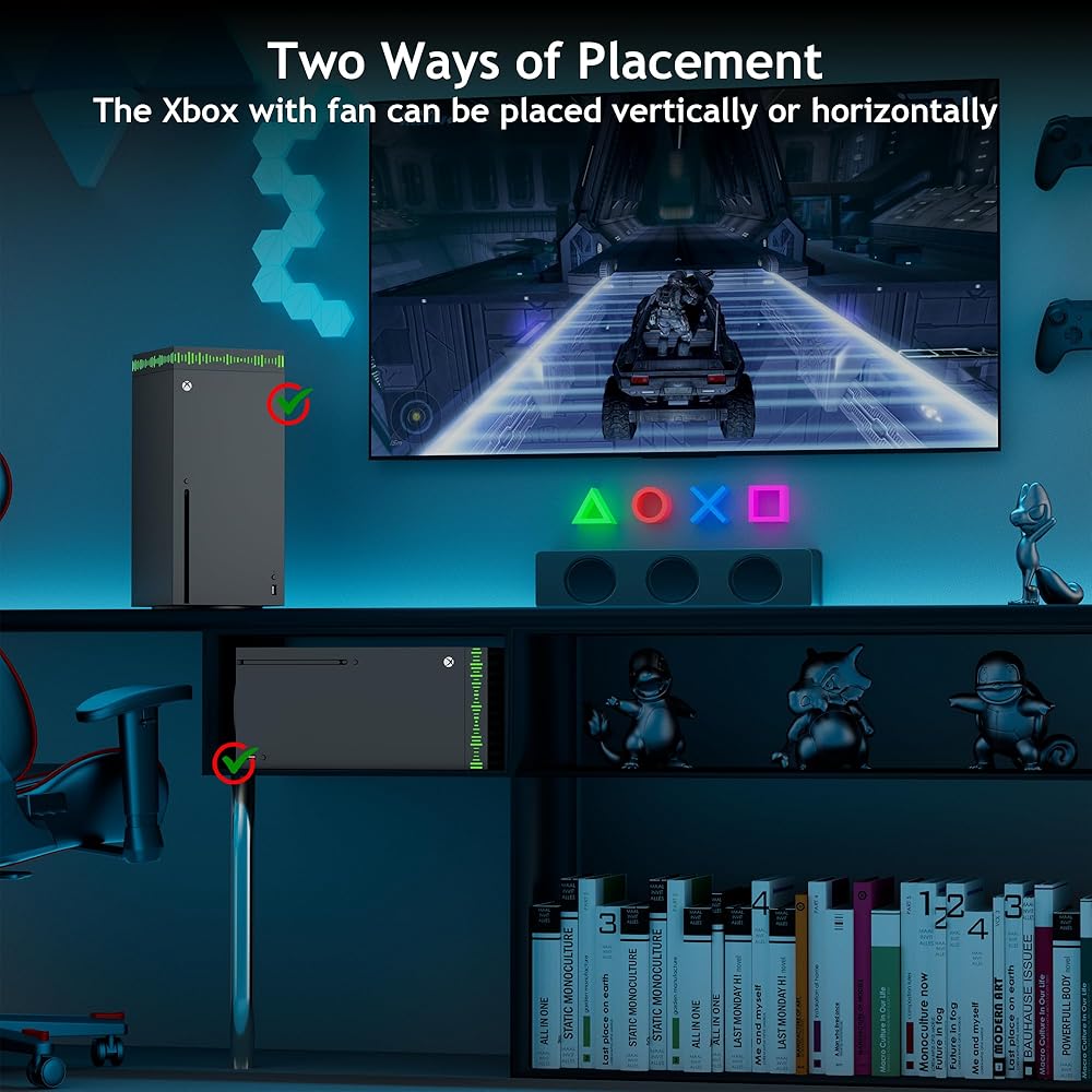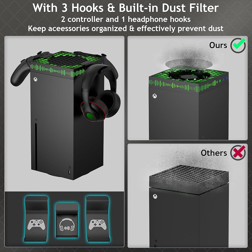 【Upgraded RGB Cooling Fan with Dust Filter】This Xbox Series X cooling fan integrates three functions of the heat dissipation, dustproof and stunning RGB lighting: This RGB cooling fan with dust filter for Xbox Series X has strong wind to cool the console quickly, built-in dust filter to prevent dust and pet hair from entering the console, with 13 RGB light modes. And equipped with 3 detachable controller and headphone hooks to store your Xbox Series X gaming accessories.