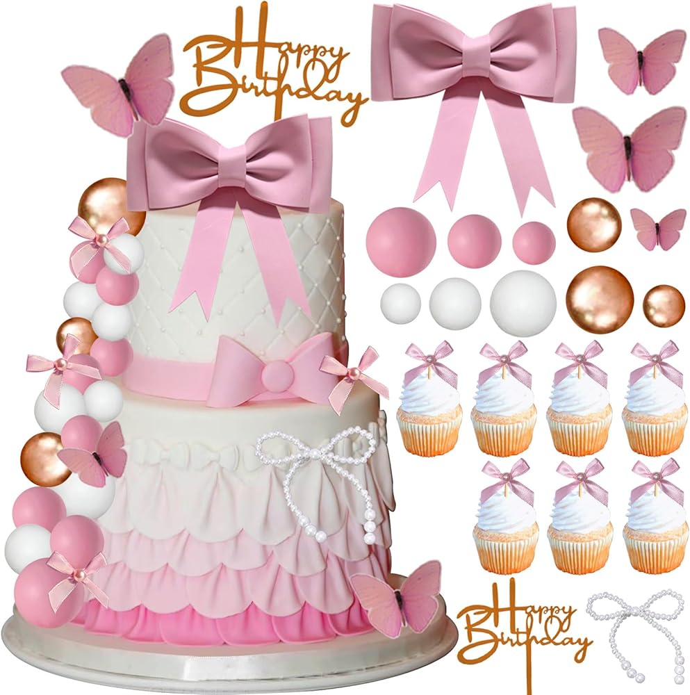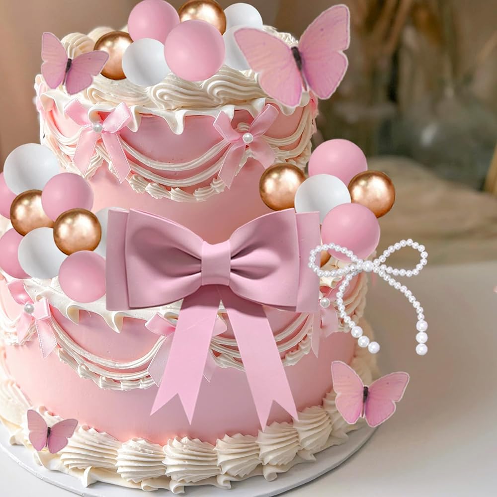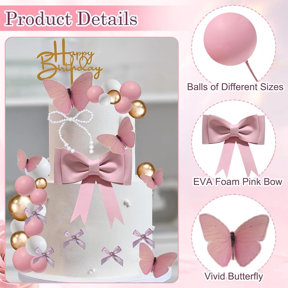 【Package Included】The pink bow cake decoration package includes 1 oversized pink bow cake decoration, 1 happy birthday cake topper, 1 pearl bow cake decoration, 5 butterfly cake toppers, 10 bow with pearl cupcake toppers, 8 pink balls, 8 white balls, and 8 gold balls. Size as the picture shows