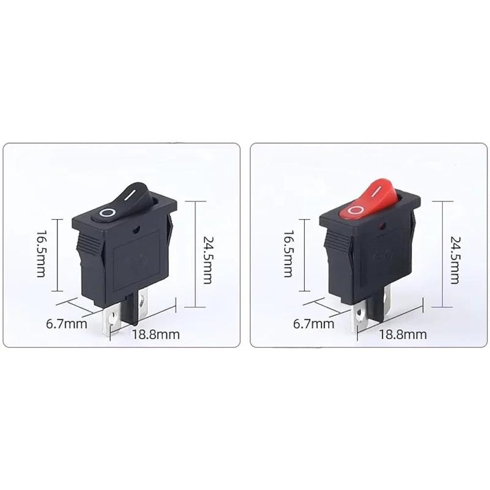 Upgrade your electronic projects with these compact KCD1-110 rocker switches. The super-thin 10x22mm profile makes them perfect for space-constrained installations while maintaining reliable functionality. Each switch features a simple 2-pin SPST (Single Pole Single Throw) configuration for straightforward power control applications. The durable black housing provides excellent resistance to daily wear, while the smooth rocker action ensures consistent performance. This 5-pack of switches is ideal for instrument panels, small appliances, and various electronic applications where precise on/off control is needed. The switches combine a professional appearance with practical functionality, featuring clear ON/OFF markings and secure terminal connections. Their versatile design makes them suitable for both DIY projects and professional installations, while the standardized dimensions ensure compatibility with common panel cutouts. These switches deliver dependable performance in a space-saving form factor that's perfect for modern electronic devices and control panels.