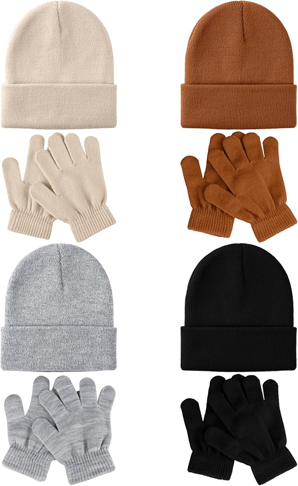 PACKAGING DETAILS: Each set includes 4 pairs of winter kids gloves and 4 beanie hats, suitable for boys and girls, with a variety of colors to choose from, and a fashion and excellent choice for everyday wear