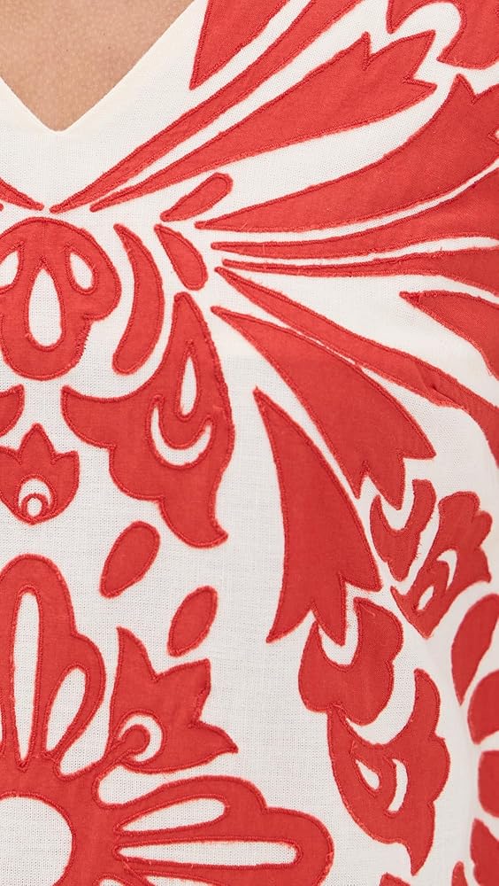 - Contrast floral appliques, Tiered hem and scalloped edges