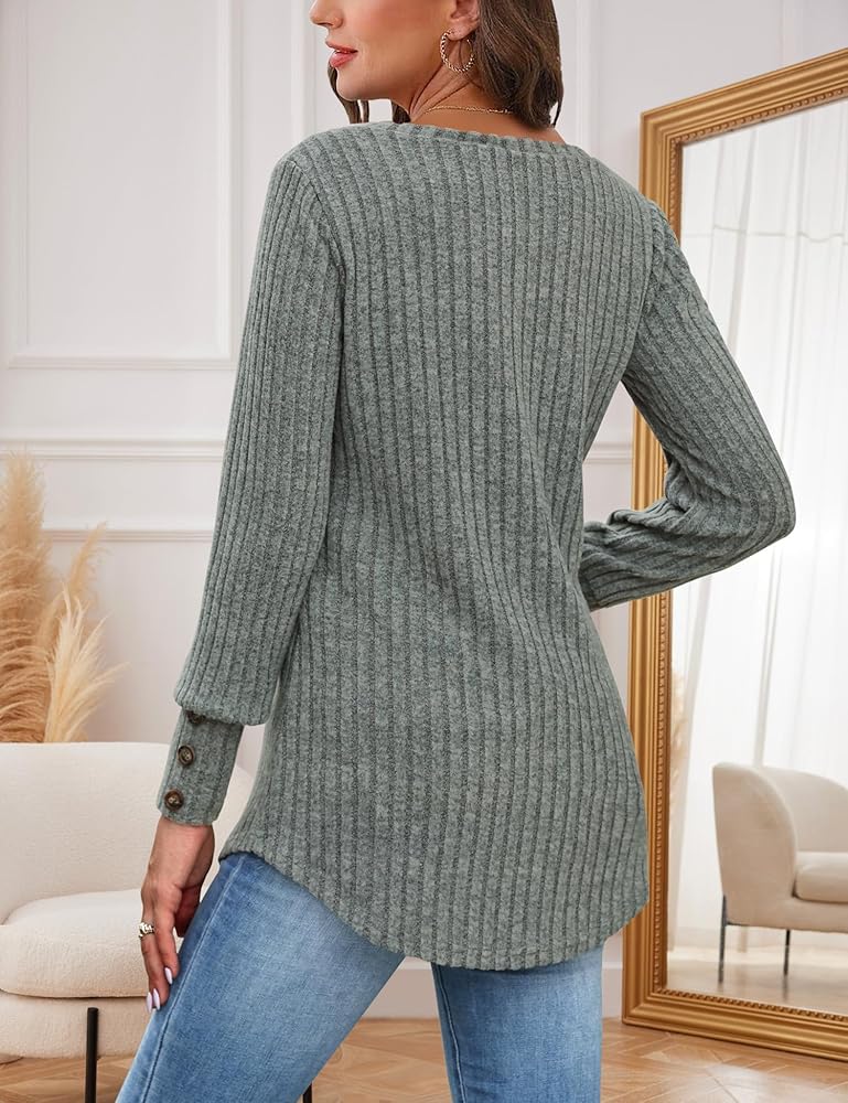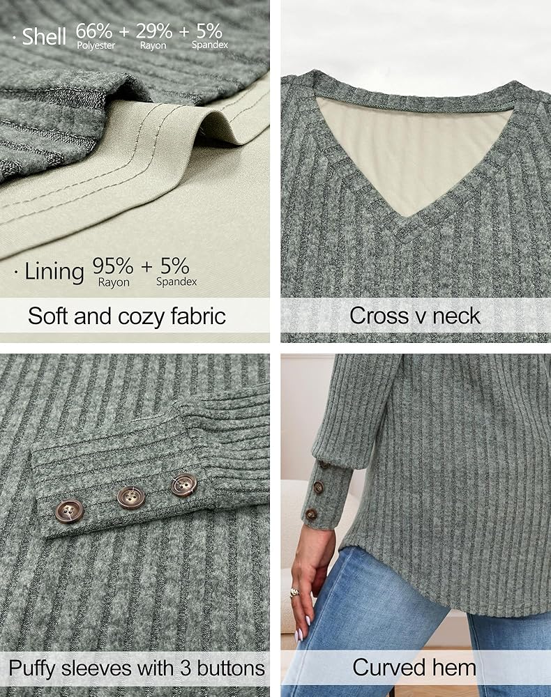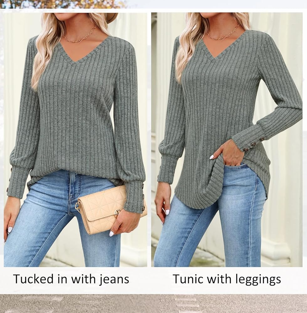 Features: Womens fall sweater comes with a cute cross over v neckline; Flowy curved hem that provides coverage over the belly and hips, gives your a more slimming look; Dressy puff sleeve with 3 button detailing on the side of each cuff, make it a little more elevated than a basic long sleeve top; Trendy tunics or tops to wear with leggings
