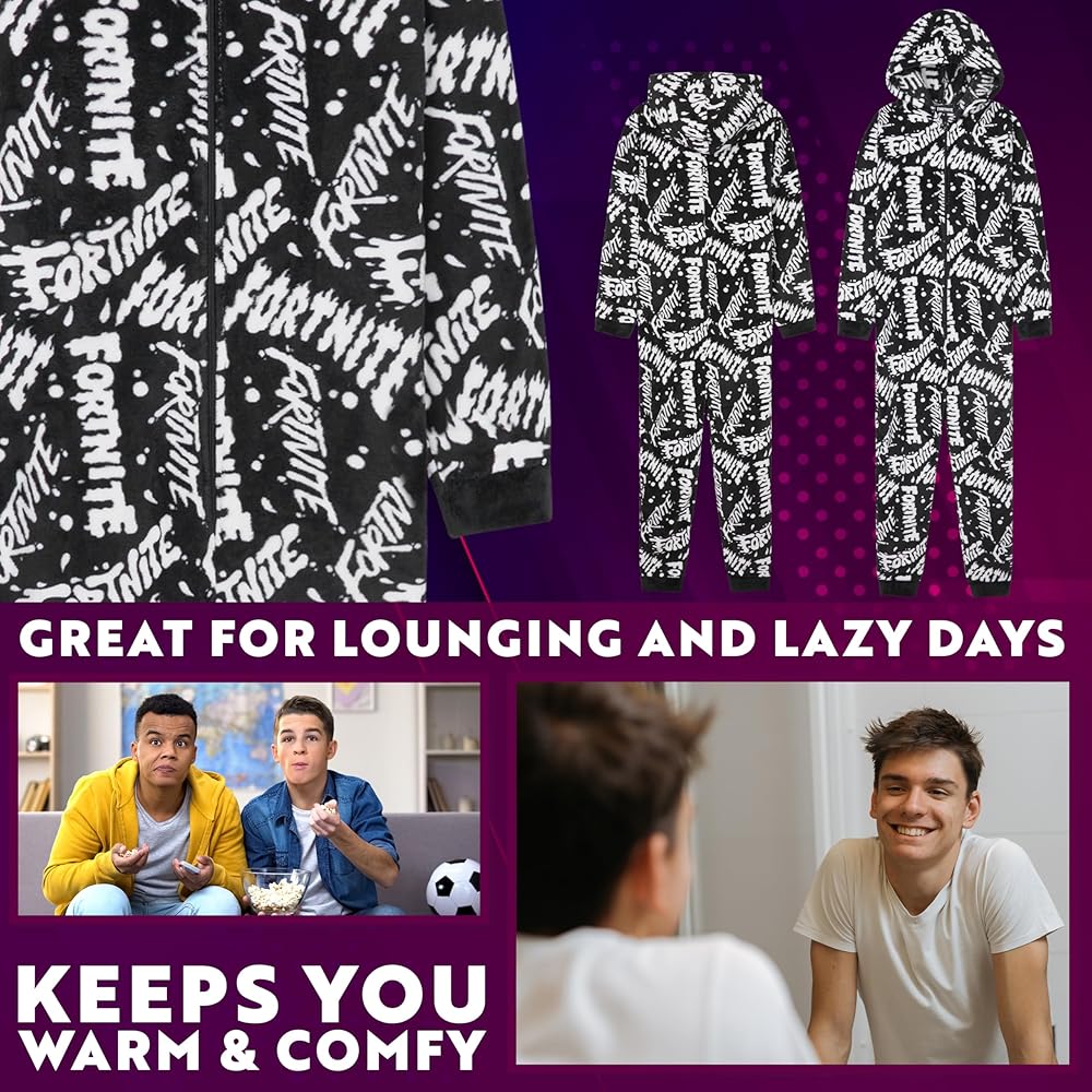 • Cool Fortnite style: This boys fleece jumpsuit features bold Fortnite designs, making it a favorite among young fans. Ideal for lounging, bedtime, or expressing gamer style in cozy pajamas.
