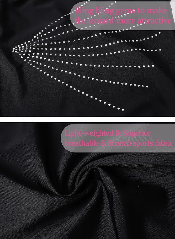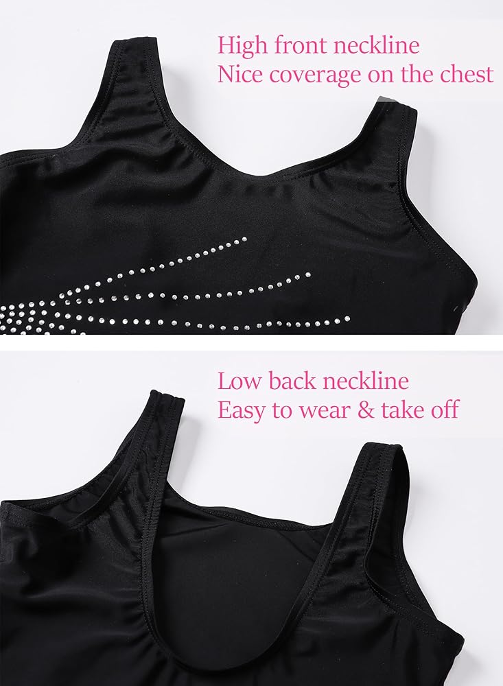 Cute Sleeveless practice girls gymnastics outfit.Girls leotards for gymnastics design : Classic solid color(Pink, Black, Light Purple, Navy Blue,Light Blue)+Interesting patterns with many bling bling sparkly silver diamond embellishment.Girls' gymnastics leotards is higher neckline in the front and lower in the back, nice coverage on the chest,but also show elegant lines, so that your kids stands out among peers, shine on the stage,leotard for girls easy for girls to take on and off.