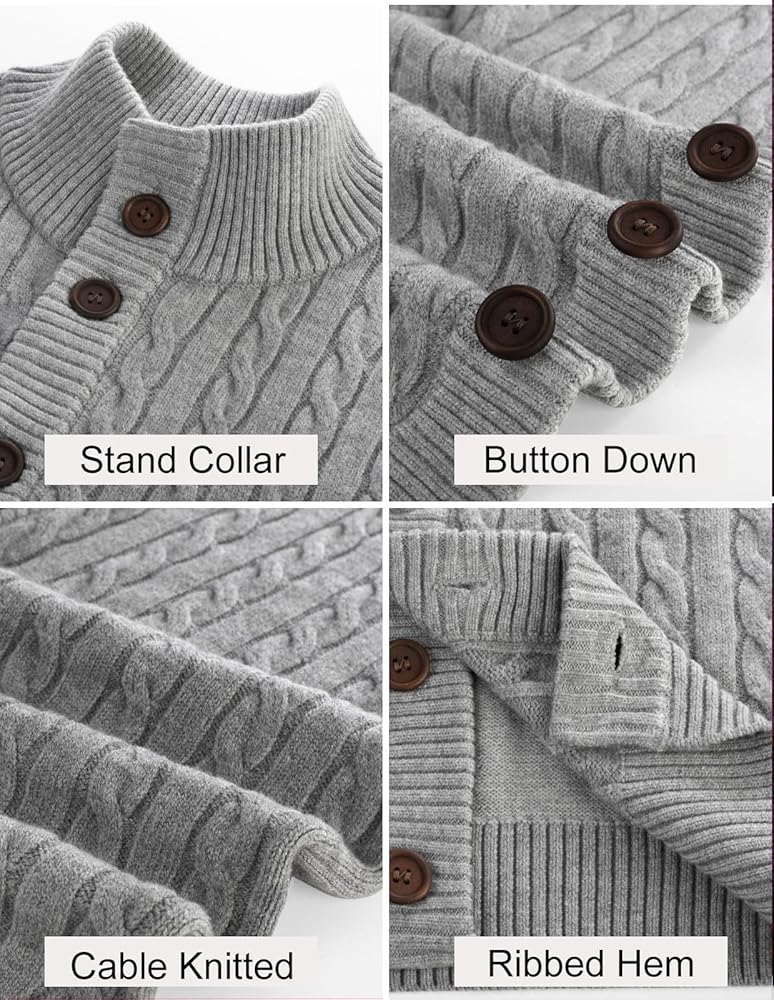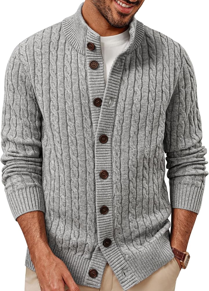 Men Cardigan: Classic stand collar with twisted cable patterns, 8-button placket closure, and ribbed cuffs and hem. Solid-color minimalist design for timeless elegance