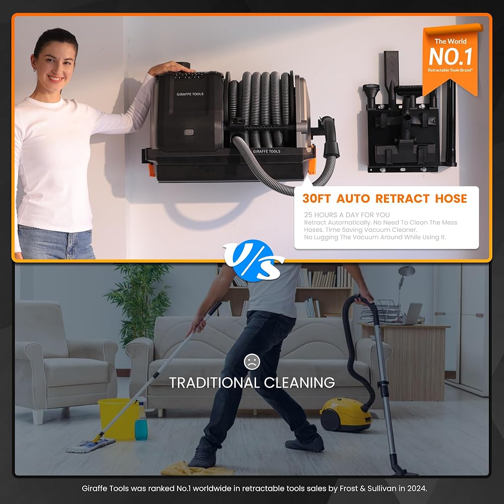 Giraffe Tools Grandstorm Wet Dry Vacuum Cleaner with 6 Nozzles, 30 FT Retractable Hose Wall Mounted Vacuum Cleaner for Car Detailing, Grey(No Remote Control Funtion)