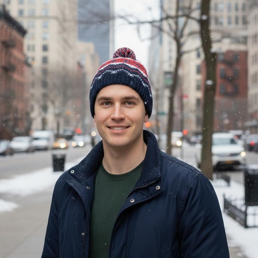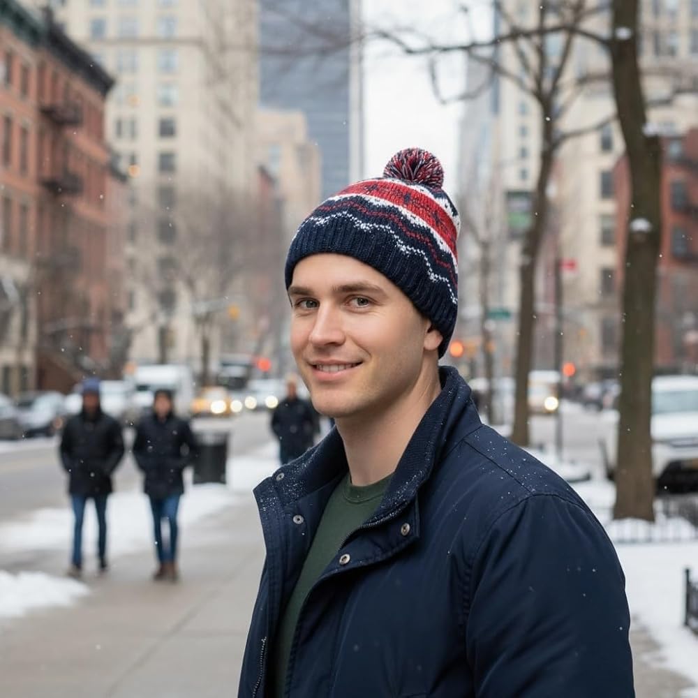 Holiday Cheer in Every Stitch: This knit hat features a playful red reindeer design and a fluffy pom-pom on top, capturing the spirit of Christmas
