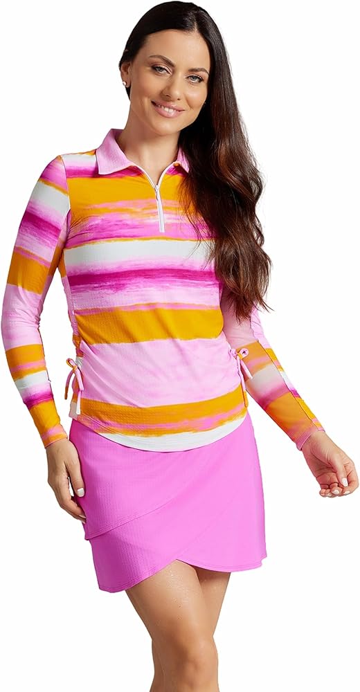 Fresh, fun, and fully adjustable—the Adjustable Length Long Sleeve Polo in the Amy Print lets you customize your look with side ties that allow for a personalized fit and length. A classic polo collar and quarter-zip neckline offer sporty polish, while printed mesh panels along the inner sleeves provide extra breathability. The Amy print pops with painterly stripes and expressive energy, making it a standout for both performance and everyday wear. Made with patented Iceƒil cooling technology, UPF 50+ sun protection, moisture-wicking fabric, and anti-odor properties, this top keeps you cool, dry, and comfortable all day long.