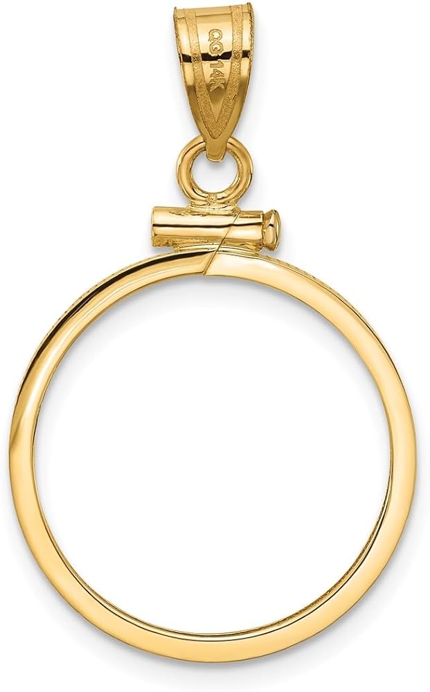 The bezel fits 5 Pesos. Product Type Jewelry | Jewelry Type Mountings | Mounting Type Coin Mountings | Pendant/Charm Type Coin Bezels | Material Primary Gold | Material: Primary Color Yellow | Material Primary Purity 14K | Length of Item 31 mm | Width of Item 19.6 mm | Country of Origin UNITED STATES | Metal 14k Yellow Gold | Bail Length 7.55 mm | Bail Width 3.64 mm | Charm/Element Length 25.1 mm | Charm/Element Width 19.6 mm | Coin Note Product does not include coin | Feature Screw Top | Feature 2 Solid | Finish Polished | Gender Unisex | Thickness 1.95 mm