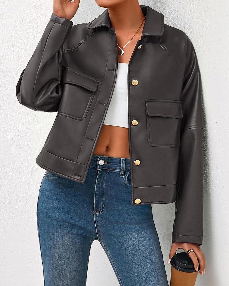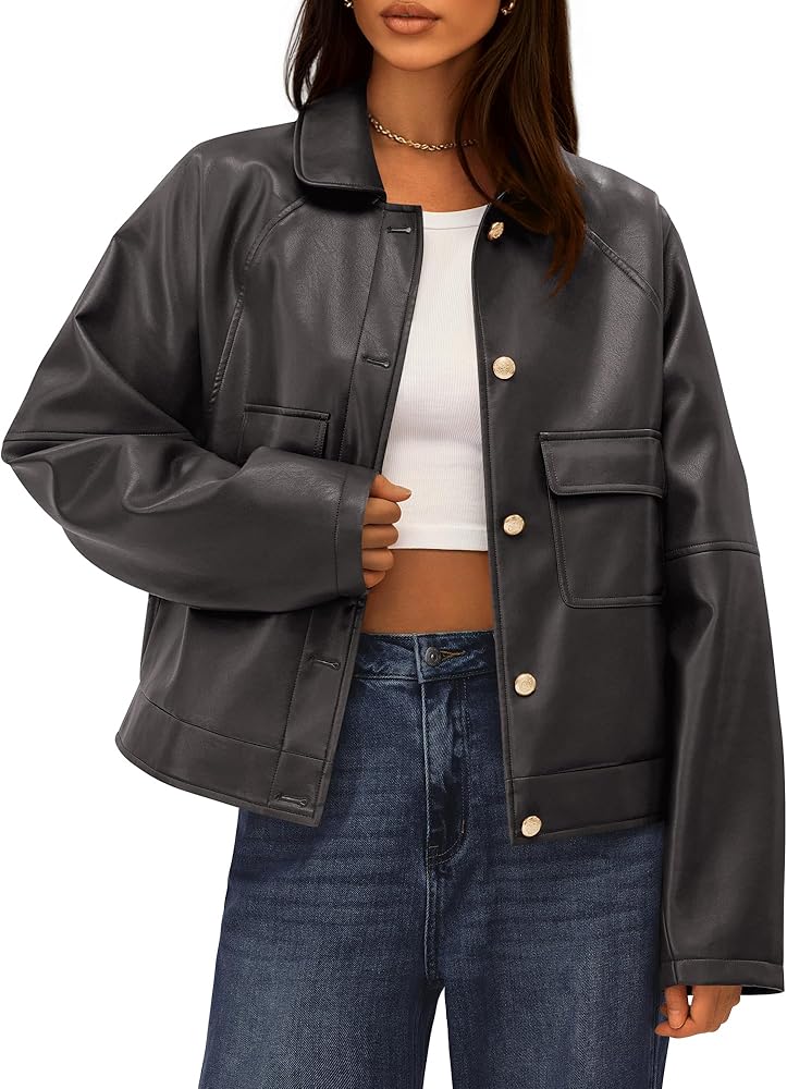 FEATURES: Faux Leather Jacket Women, Long Sleeve Jackets, Button Down Coats, Oversized Jacket For Women, Leather Outwear Jackets, Front Patch Pockets, Solid Color, Fits For Spring, Fall, Winter