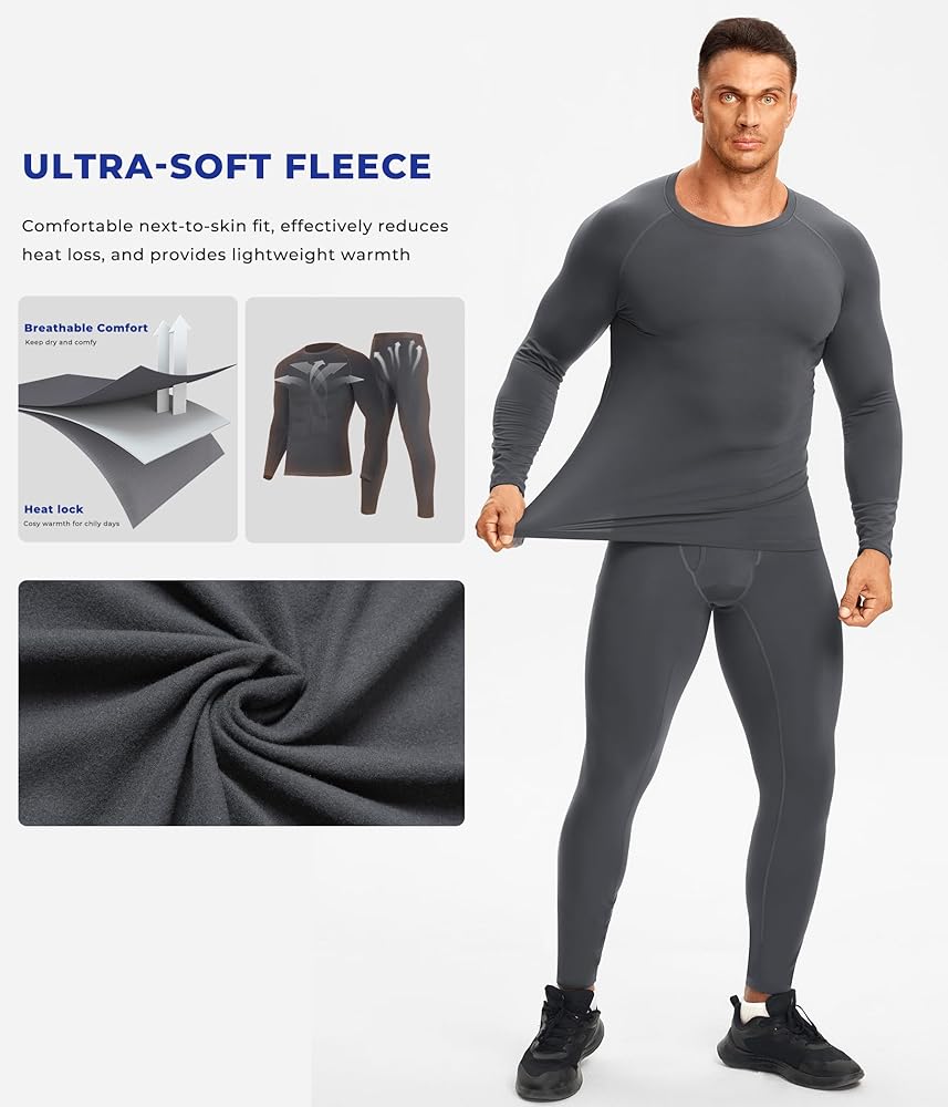 Plush Heat-Trapping Base Layer: These ultra-soft long johns for men thermal feature a toasty fleece lining that locks in body heat, acting as your essential mens thermal long sleeve shirt for harsh climates – seamlessly disappearing under puffer jackets or doubling as cozy pajamas for windy commutes and chilly nights